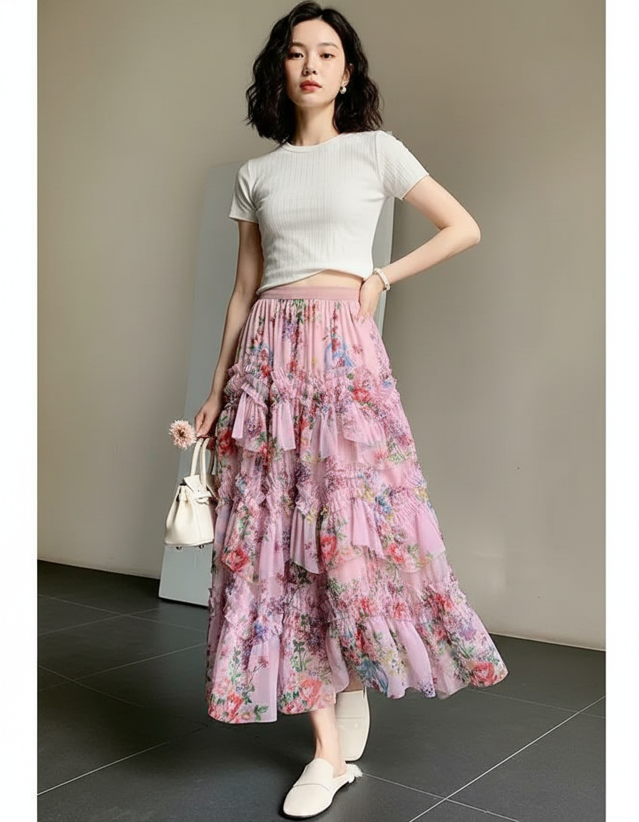 Jupe Longue Rose Florale À Volants Élégante : Usage