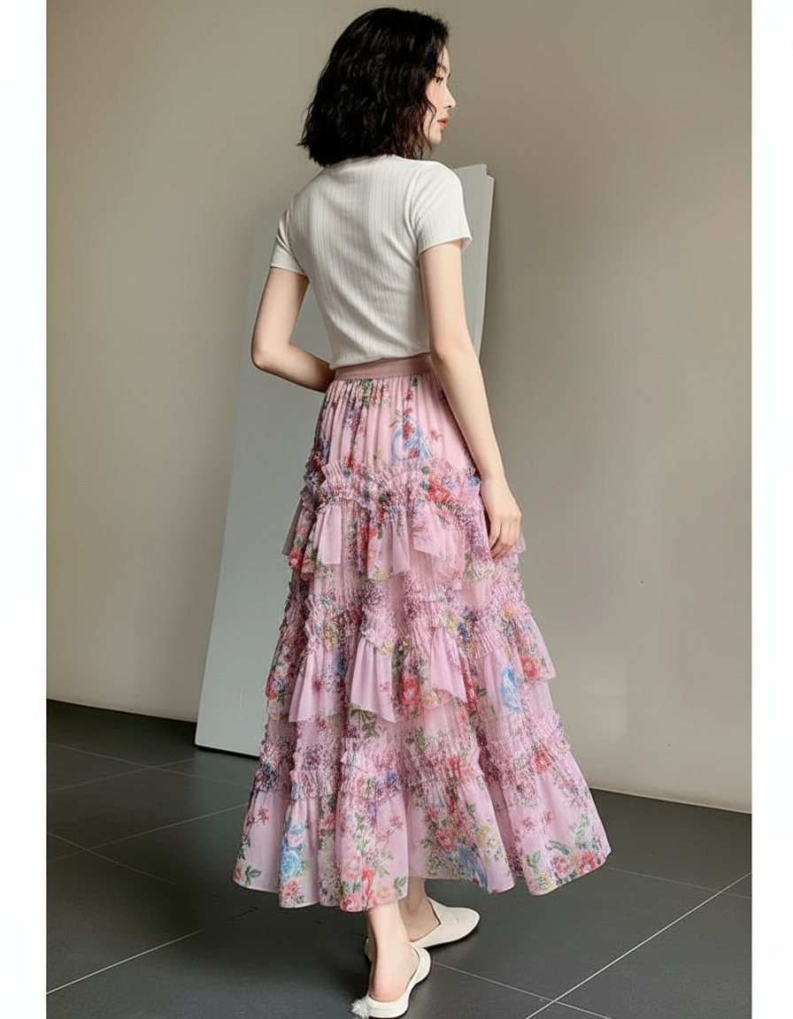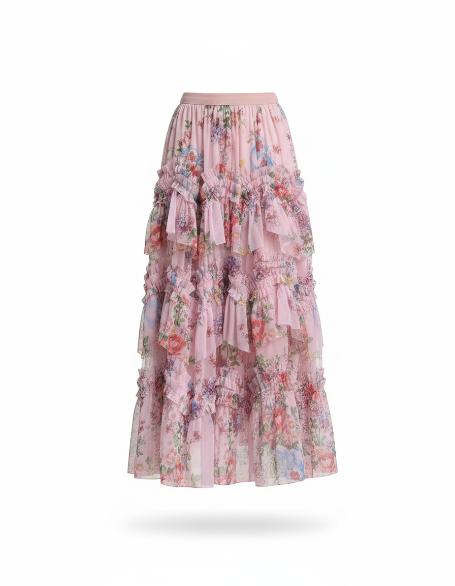 Jupe Longue Rose Florale À Volants Élégante : Caractéristiques