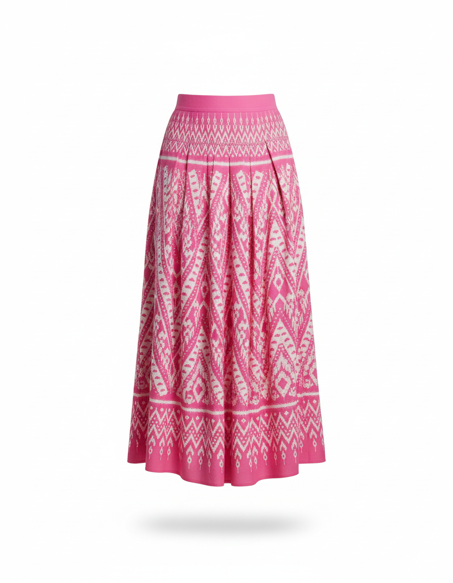Adoptez l'élégance et le confort avec cette jupe longue rose vibrante, ornée d'un motif ikat distinctif.