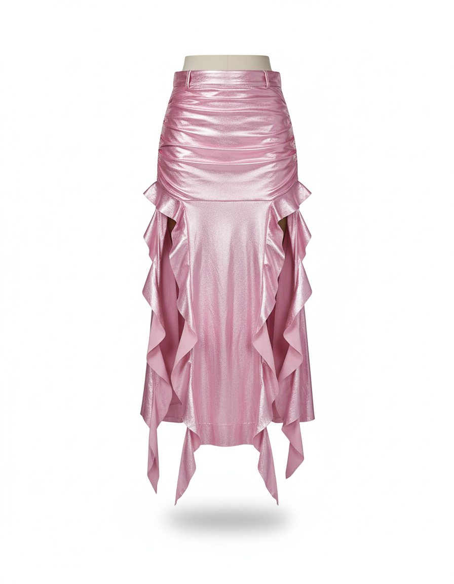 Adoptez un look audacieux et tendance avec notre jupe longue rose métallisé à volants, parfaite pour se démarquer.