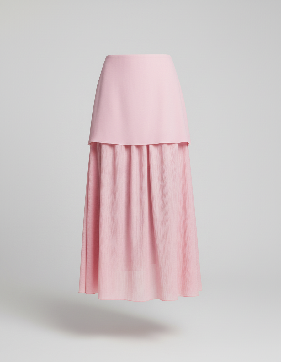 Cette jupe longue présente une couleur rose pâle avec une coupe à double couche. La partie inférieure de la jupe est plissée, tandis que la partie supérieure est lisse.