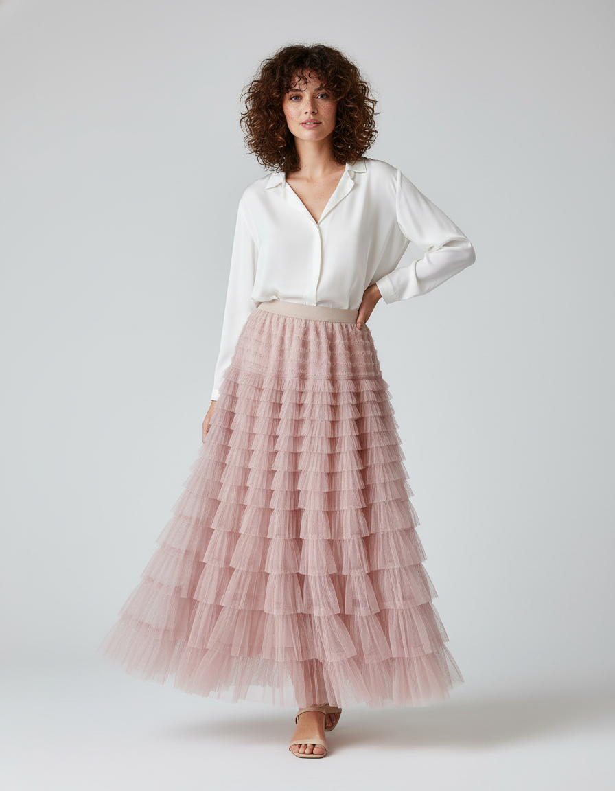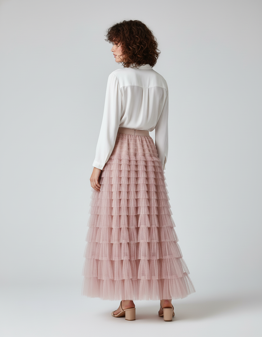Idéale pour toutes vos cérémonies, des mariages champêtres aux soirées de gala, cette jupe se prête à une multitude de styles. Associez-la à une blouse en soie crème et des talons fins pour une allure sophistiquée et romantique. Pour une occasion plus décontractée mais tout aussi chic, imaginez-la avec un top ajusté et de jolies sandales plates. La Jupe Fluide à Volants Rose Poudré est l'incarnation même du raffinement, une invitation à la rêverie et à l'élégance intemporelle.