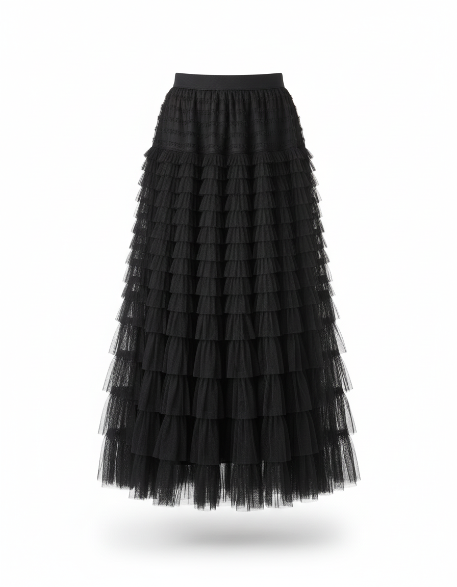 Ce qui distingue cette jupe, c'est son architecture délicate de volants en tulle superposés, créant un volume maîtrisé et un tombé parfait sans alourdir. Chaque volant est pensé pour flotter avec une aisance naturelle, offrant une texture riche et une profondeur visuelle unique. Loin des clichés, elle réinvente le romantisme avec une modernité assumée. Associez-la à une blouse en soie pour un look sophistiqué ou à un crop top épuré pour une allure plus contemporaine. Une pièce d'exception qui célèbre votre féminité avec audace et distinction.