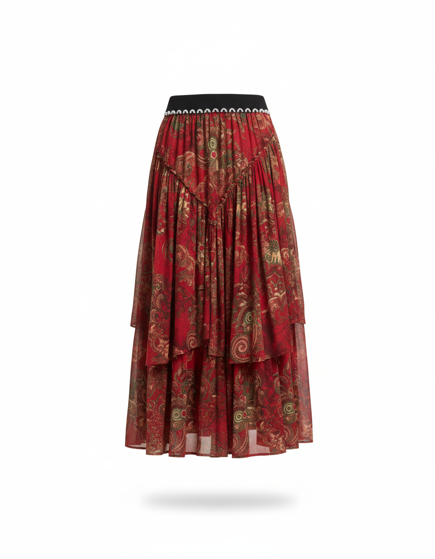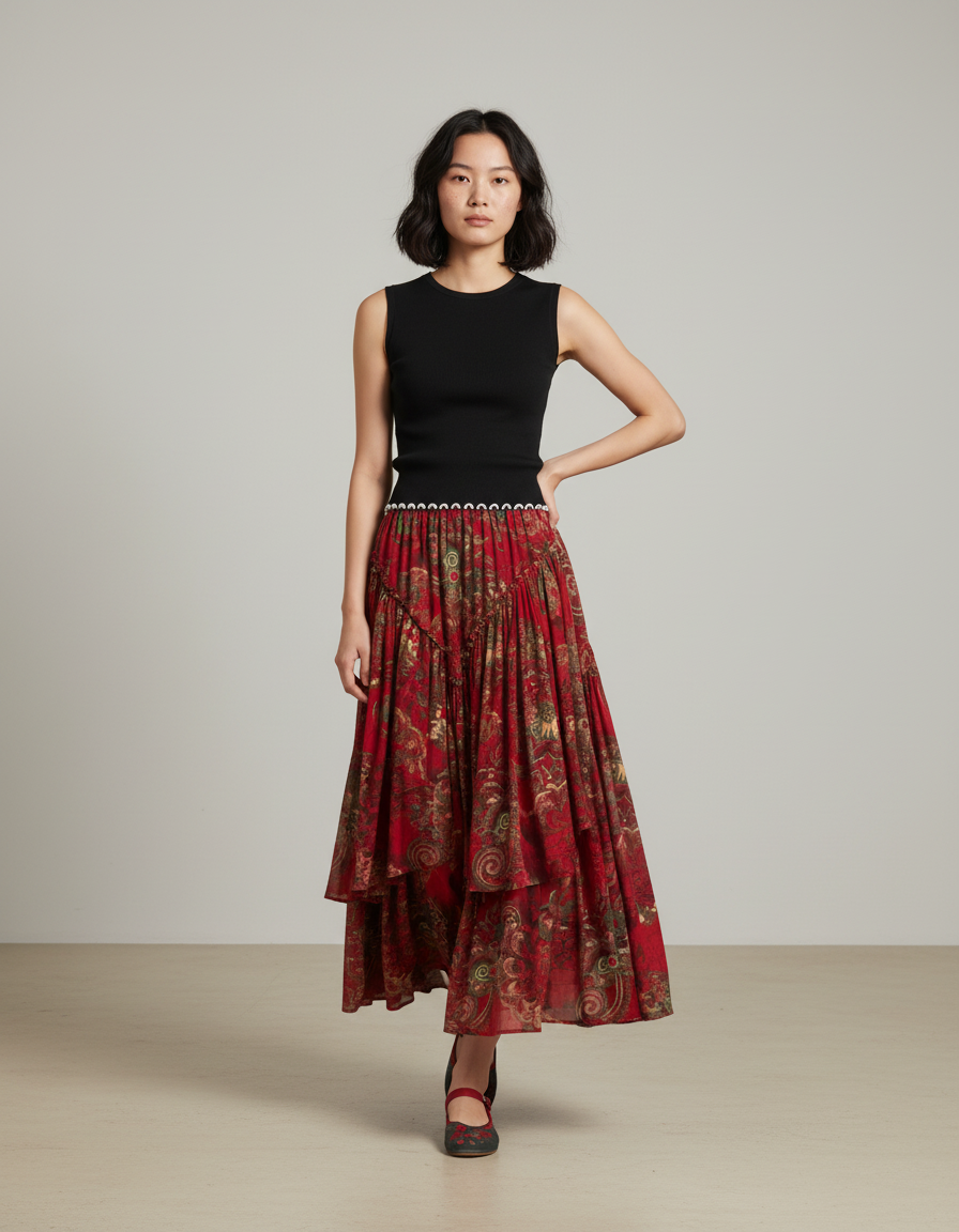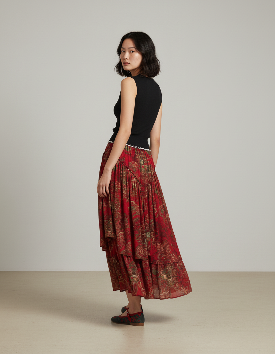 L'Éclat Bohème Réinventé : La Jupe Longue Rouge À Volants