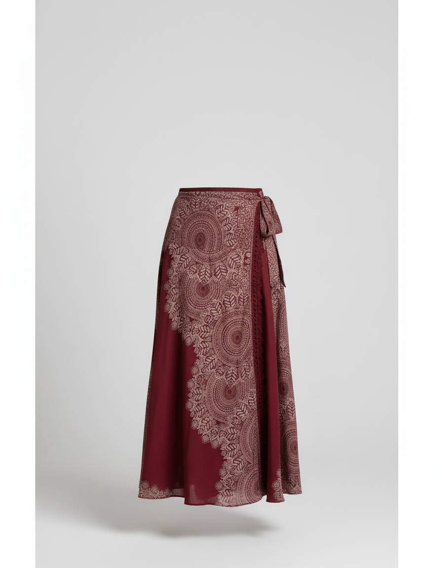 Cette jupe longue est de couleur rouge bordeaux et présente une coupe portefeuille. Elle est ornée de motifs clairs sur l'ensemble du tissu.