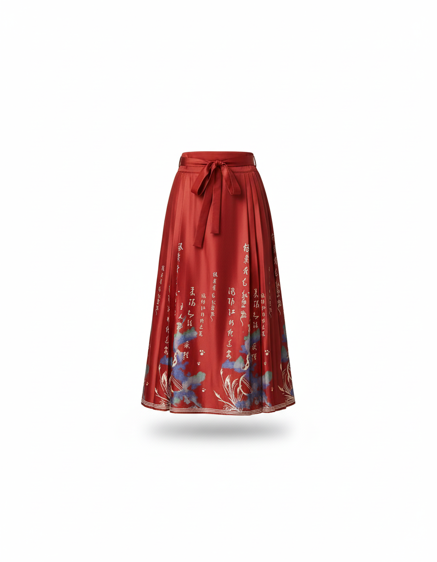 Cette jupe présente une coupe longue avec un fond rouge. Elle est ornée de motifs floraux au bas et de motifs calligraphiques sur le corps principal.