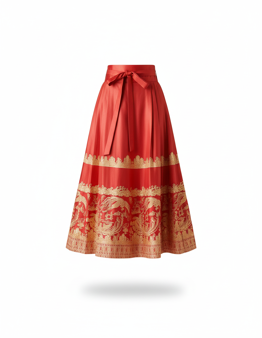 Éclat Sophistiqué : La Jupe Longue Plissée Rouge aux Motifs Dorés