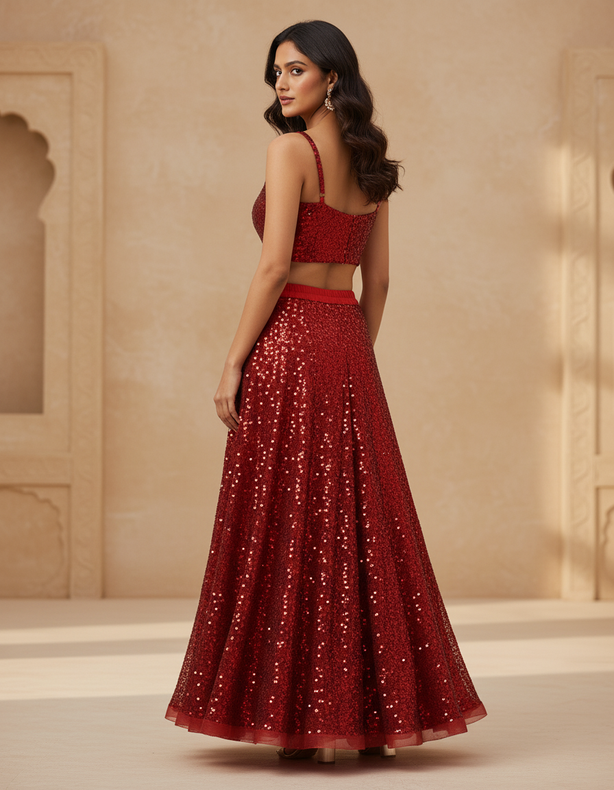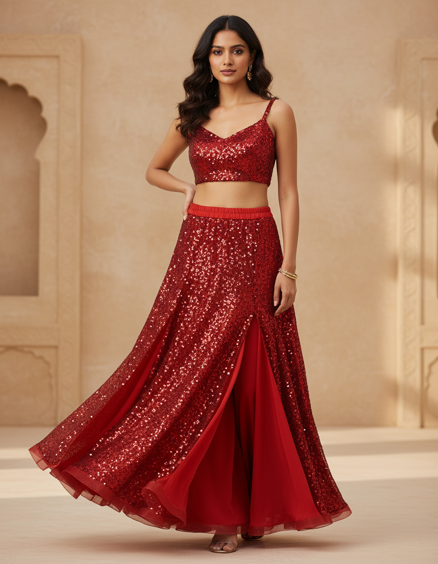 Rayonnez de mille feux avec cette jupe longue rouge entièrement pailletée, parfaite pour toutes vos occasions spéciales.