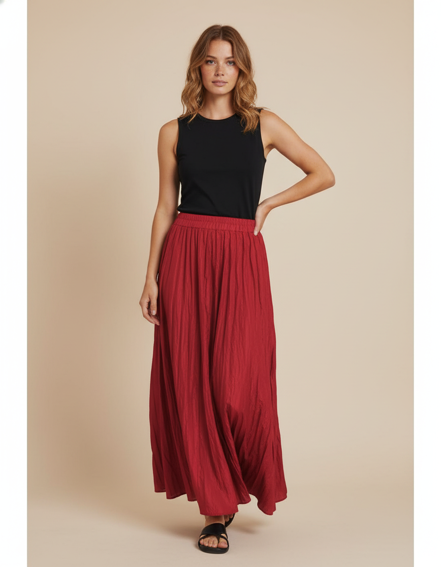 Découvrez le style décontracté et chic avec notre jupe longue rouge plissée fluide, idéale pour toutes vos occasions.