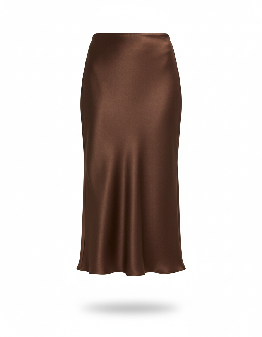Élevez votre style avec notre jupe longue en satin couleur chocolat, parfaite pour toute occasion.
