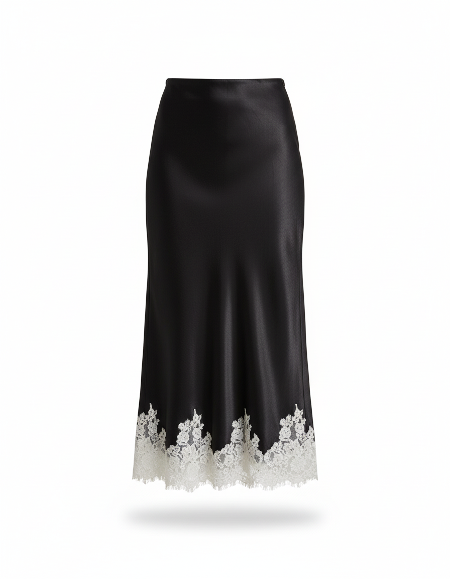 Ce qui la rend véritablement unique, c'est sa bordure délicatement ornée d'une dentelle blanche exquise. Ce contraste saisissant et ce détail raffiné transforment une jupe en satin classique en une déclaration de mode audacieuse et poétique. Elle est parfaite pour celles qui apprécient les finitions d'exception et souhaitent se démarquer avec un luxe discret et moderne. Une invitation à redéfinir le chic avec une touche d'audace.