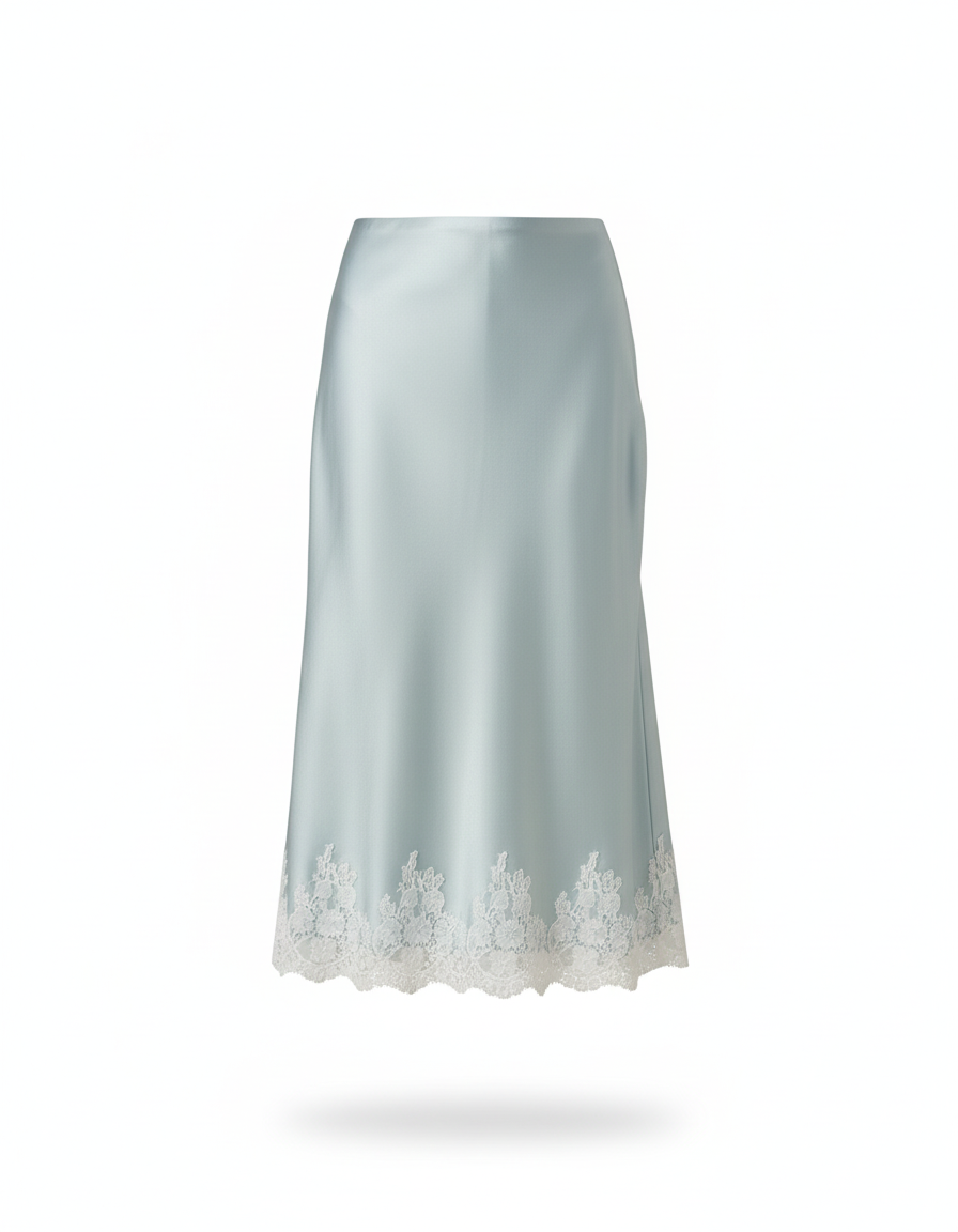 Cette jupe longue en satin, ornée de dentelle délicate, offre une élégance raffinée pour vos soirées.