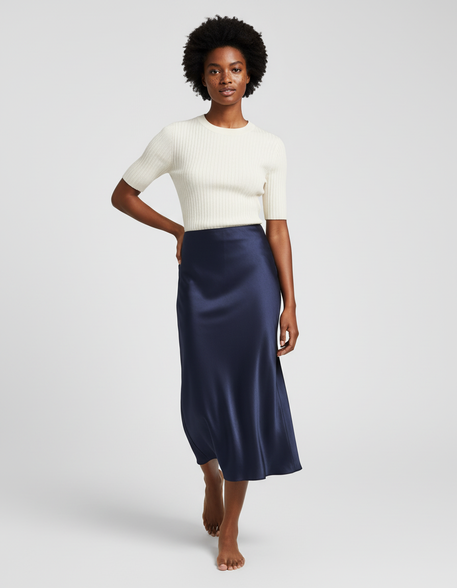 Ce qui distingue notre jupe, c'est l'harmonie parfaite entre la richesse de son tissu et la fluidité de sa coupe évasée. Le bleu marine profond, à la fois classique et contemporain, capture la lumière avec une subtilité exquise, créant un jeu d'ombres et de reflets unique. Chaque mouvement révèle la qualité supérieure du satin, qui épouse et sublime la silhouette avec une grâce aérienne. C'est plus qu'une jupe, c'est une déclaration de style, une pièce maîtresse conçue pour durer et pour vous faire sentir exceptionnellement belle.