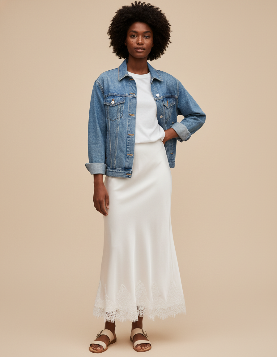 Découvrez la Jupe Longue Satinée Dentelle Élégante, une pièce maîtresse qui allie raffinement et polyvalence. Confectionnée dans un satin fluide d'un blanc immaculé, sa coupe évasée sublime la silhouette avec une grâce naturelle. Le délicat ourlet de dentelle ajoute une touche de sophistication intemporelle. Idéale pour vos soirées habillées, associée à un top en soie et des talons, elle se transforme en un clin d'œil. Pour un style plus audacieux et contemporain, mariez-la à une veste en jean décontractée et des sandales plates, comme le suggère la tendance actuelle, pour un chic décontracté sans effort.