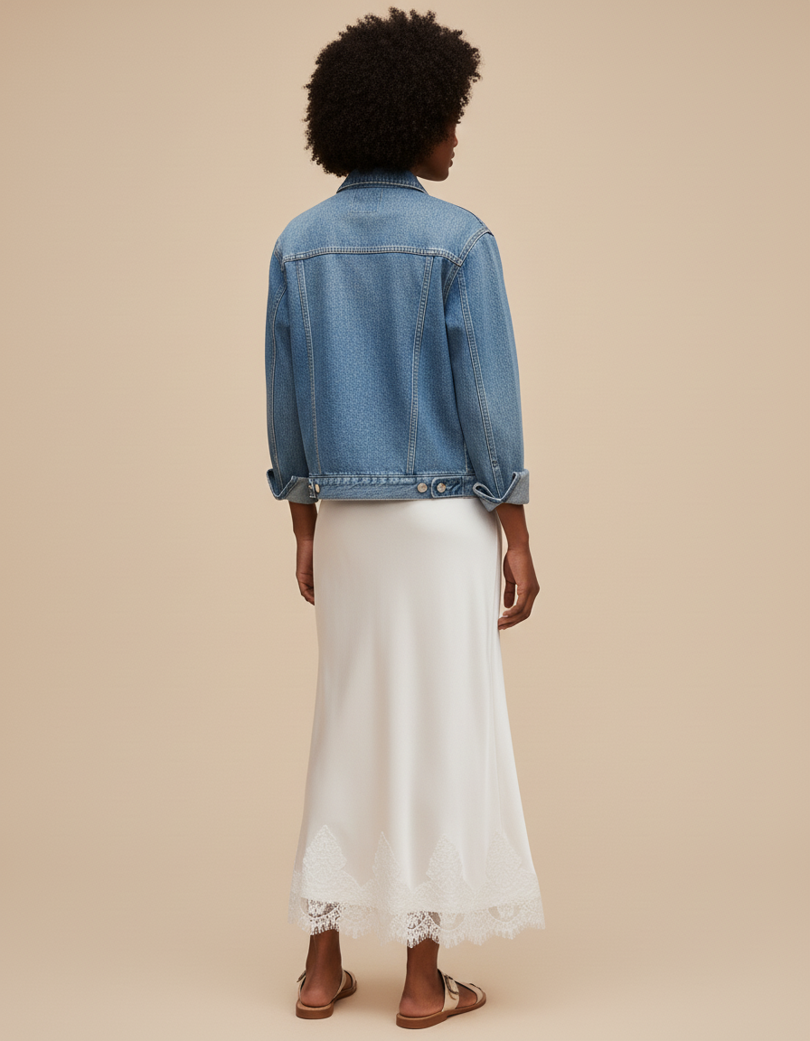 Ce qui distingue véritablement cette jupe, c'est l'alliance parfaite entre la richesse du satin et la délicatesse de sa dentelle. Une bande de dentelle fine, discrètement intégrée à l'ourlet, ajoute une touche de raffinement subtil, élevant cette pièce au-delà du simple basique. Loin des artifices, elle incarne un luxe discret mais perceptible, un savoir-faire qui se ressent à chaque fibre. Offrez-vous la liberté d'exprimer votre individualité avec une pièce qui parle d'elle-même : une élégance authentique, distinctive et résolument contemporaine.