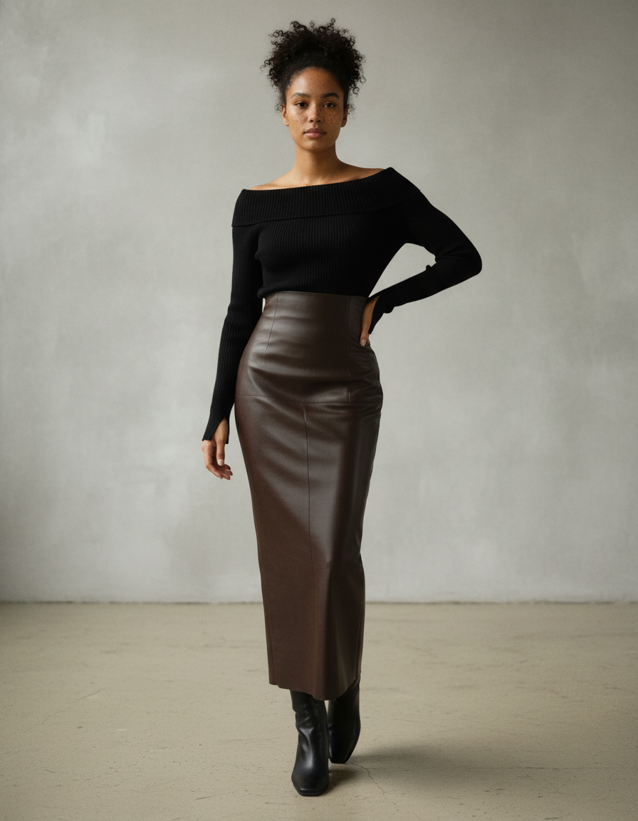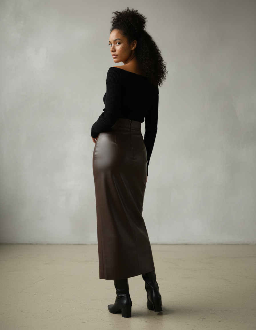 L'Élégance Hivernale Redéfinie : La Jupe Tube Simili Cuir Marron