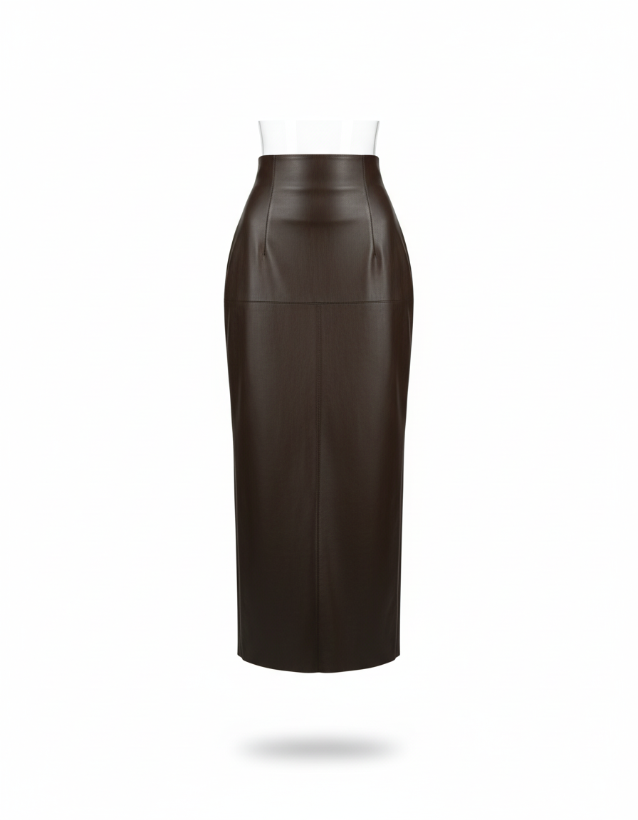 Cette jupe est un vêtement long de couleur marron, confectionné dans un matériau d'aspect cuir. Sa coupe ajustée présente une taille haute.
