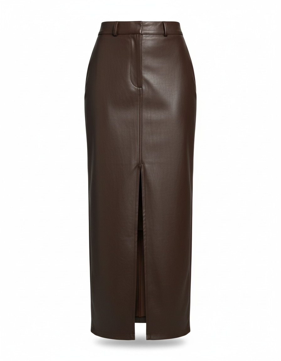 Jupe Longue Simili Cuir Fente Chic, Coupe Droite Marron