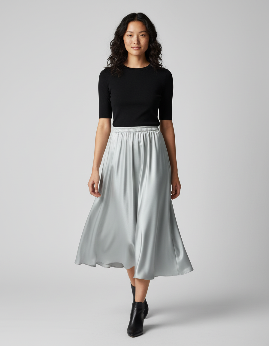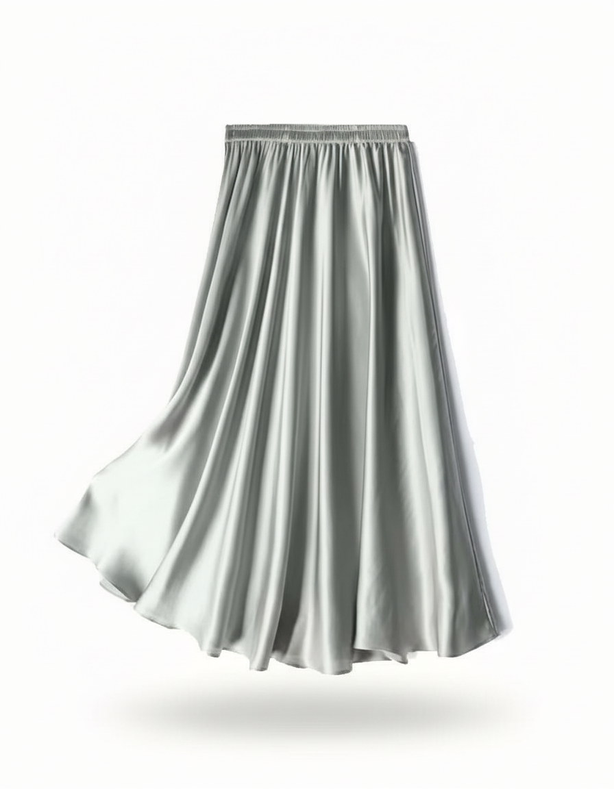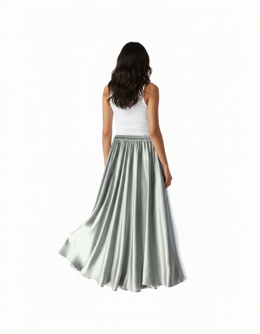 Jupe Longue Fluide en Satin Argenté : L'Art du Mouvement Élégant