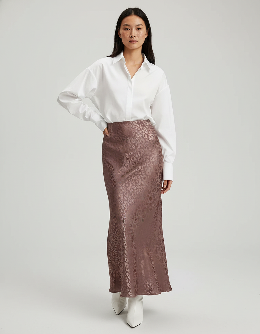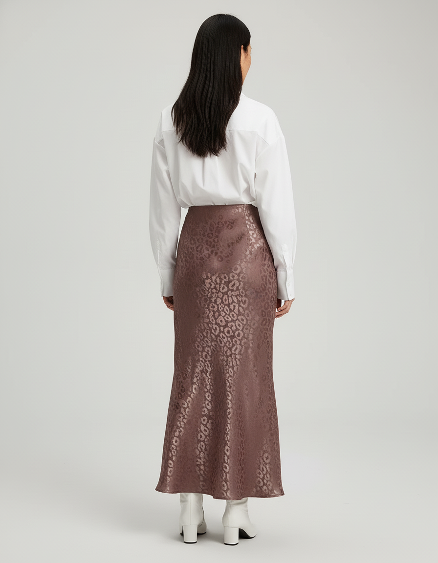 Découvrez la Jupe Longue Soie Rose, une pièce maîtresse où le luxe rencontre la légèreté. Confectionnée dans un satin fluide d'une qualité exceptionnelle, sa couleur rose poudré délicate est sublimée par un jacquard léopard ton sur ton subtil, offrant une texture visuelle raffinée sans jamais être ostentatoire. Son tombé évasé épouse gracieusement la silhouette, promettant une liberté de mouvement incomparable. Vous vous sentirez à la fois élégante et parfaitement à l'aise, enveloppée dans cette étoffe douce qui glisse sur la peau. C'est l'essence même du confort premium, pensée pour la femme moderne qui ne transige pas sur le style.
