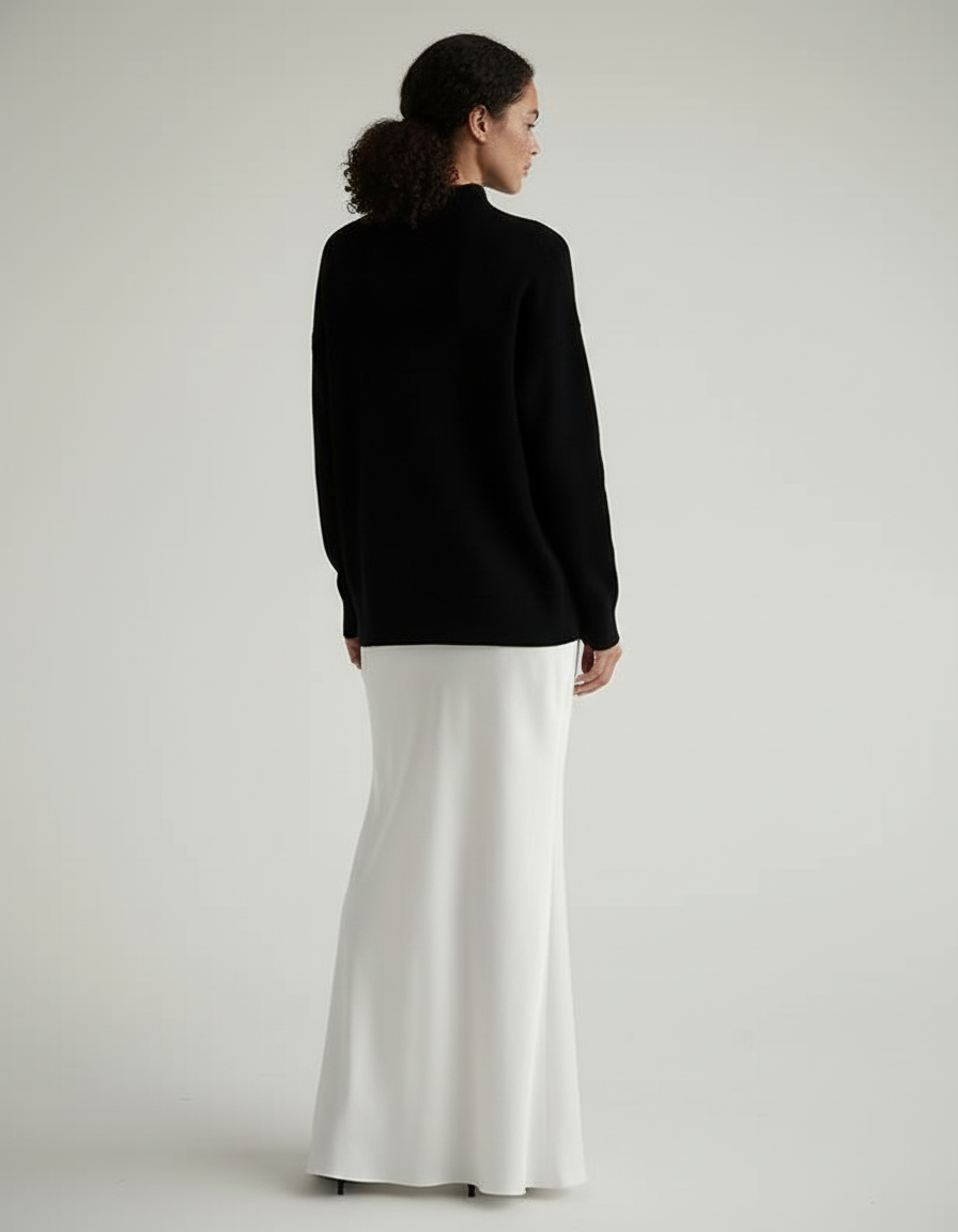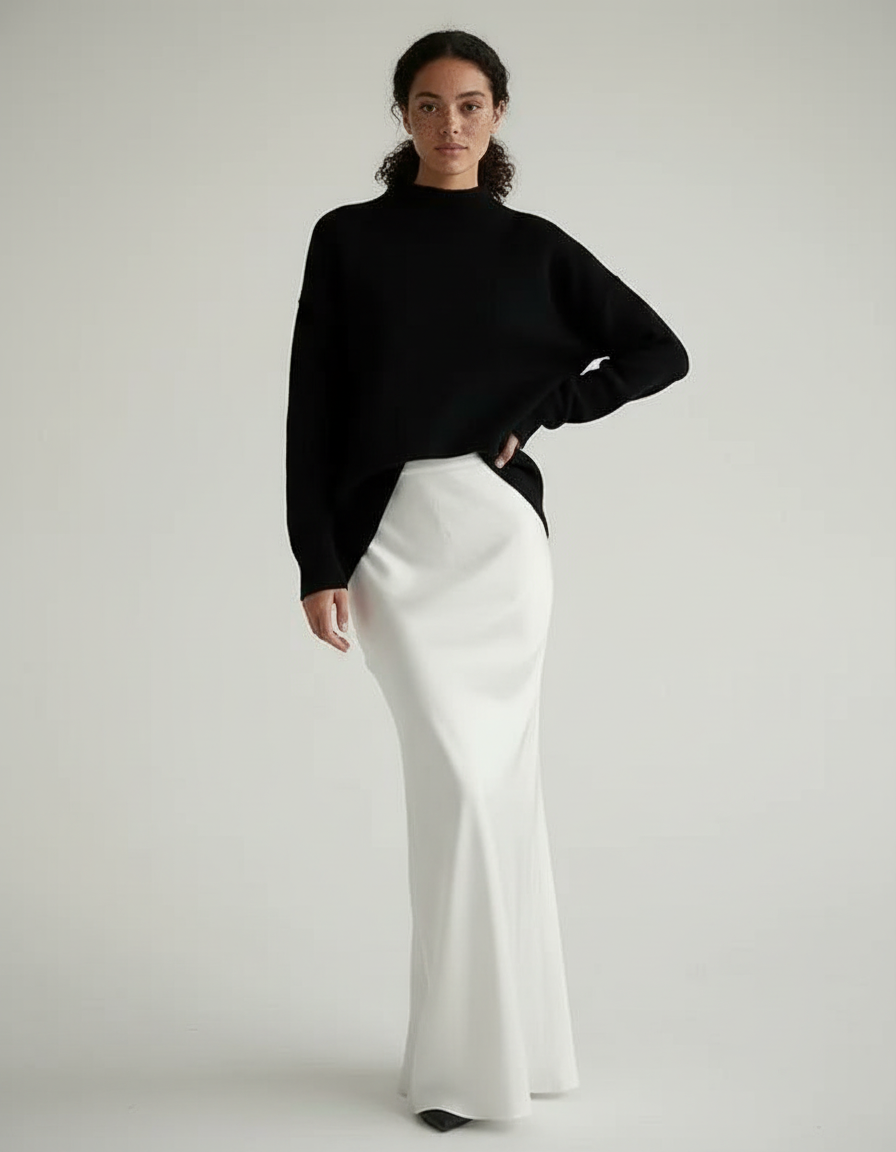 Pour un mariage champêtre, associez-la à un top en dentelle délicat et des sandales fines. En soirée, optez pour un chemisier en soie noir ou un pull oversize en cachemire, comme illustré, pour un contraste moderne et chic, parfait pour un dîner élégant ou une sortie raffinée. Cette jupe n'est pas seulement une pièce de cérémonie ; elle est une invitation à créer des looks mémorables, alliant luxe discret et praticité au quotidien, faisant d'elle un investissement intemporel dans votre garde-robe.