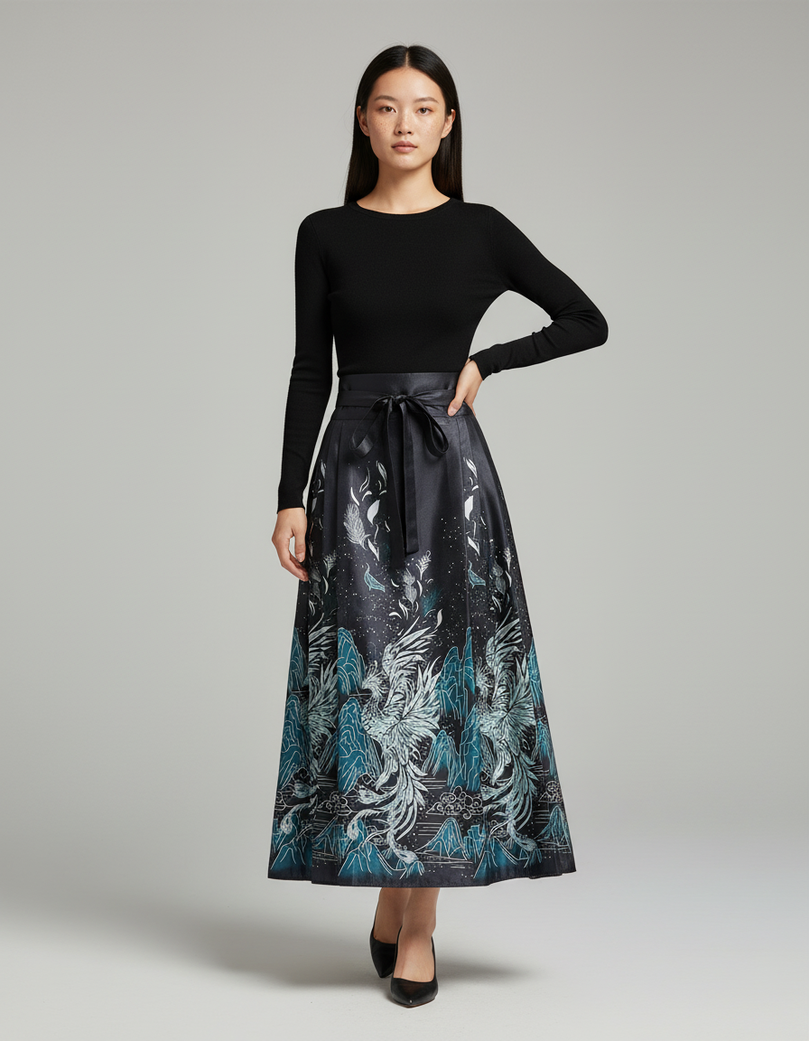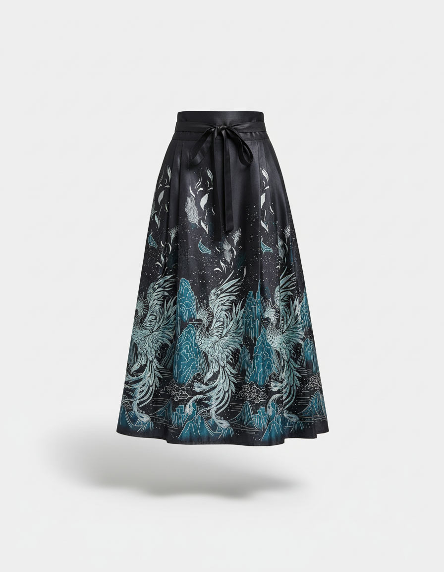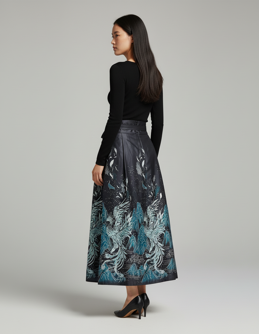 Élevez votre style avec cette jupe longue en taffetas, ornée d'un motif majestueux inspiré par la mythologie asiatique.