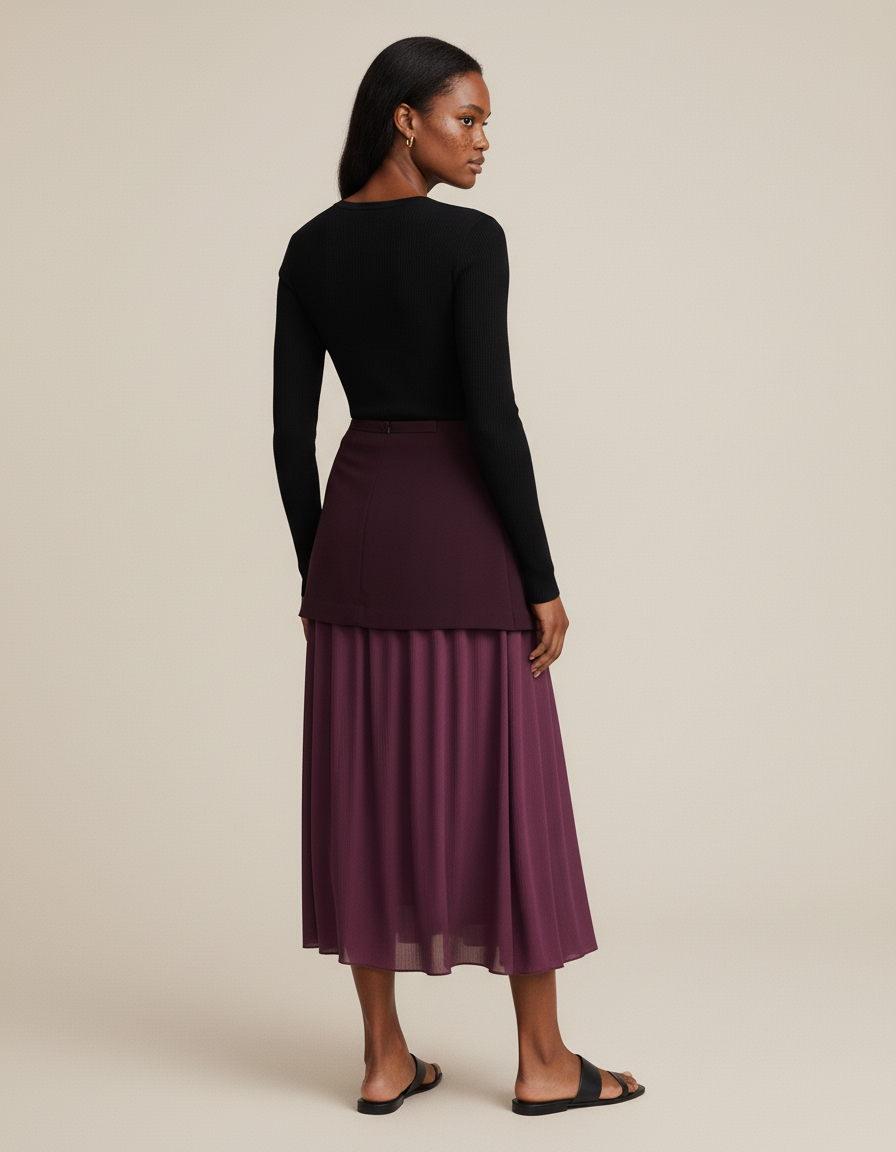 Ce qui distingue cette jupe, c'est son design superposé innovant, qui ajoute une profondeur visuelle et une texture subtile, la faisant vibrer au-delà d'une simple jupe plissée. La mousseline légère, plissée avec une précision artisanale, révèle une teinte violette profonde et captivante, facile à associer tout en affirmant votre style. Ce n'est pas seulement une jupe, c'est une déclaration de style qui promet confort, polyvalence et une touche de luxe discret, vous permettant de vous exprimer avec raffinement et originalité.