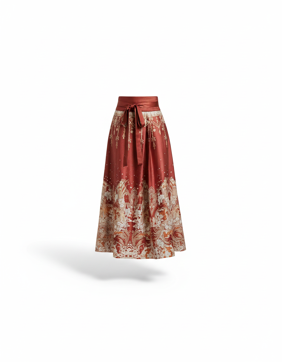 Découvrez notre Jupe Longue Taffetas, une pièce élégante et fluide qui incarne le raffinement avec son motif orné unique.