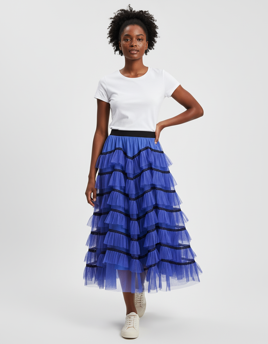Découvrez la Jupe Longue Tee Shirt, une pièce maîtresse qui transforme l'ordinaire en extraordinaire. Conçue pour la femme moderne qui ne transige ni sur le style ni sur le confort, cette jupe ample en tulle bleu vibrant, ornée de volants délicats et de subtils liserés noirs, est une invitation à l'audace élégante. Son volume spectaculaire et sa texture aérienne vous enveloppent d'une aura de sophistication décontractée, idéale pour celles qui cherchent à faire une déclaration sans effort. Elle est parfaite pour illuminer votre quotidien ou pour une occasion spéciale où vous souhaitez captiver tous les regards avec une touche d'originalité.