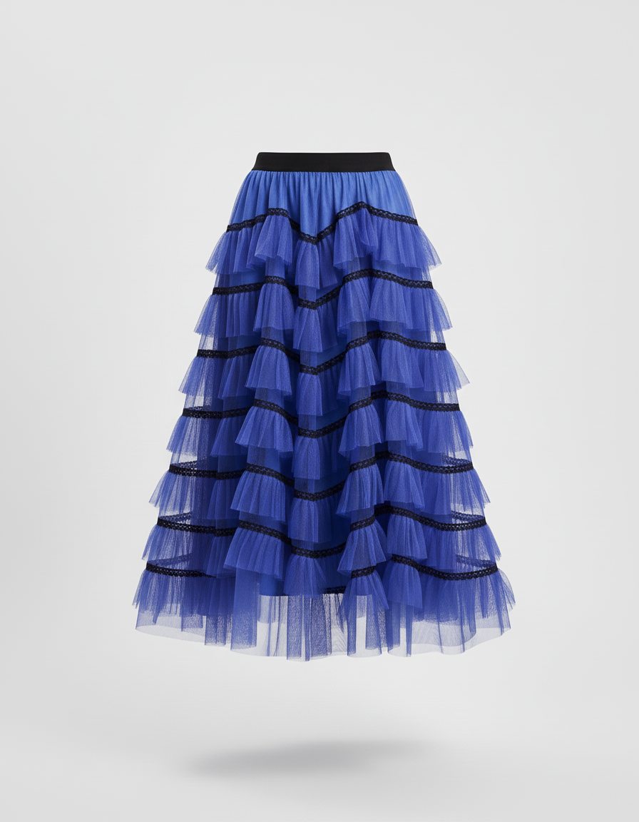 Cette jupe longue présente une superposition de volants en tulle de couleur bleue. Elle est dotée d'une taille élastique et d'une doublure interne.