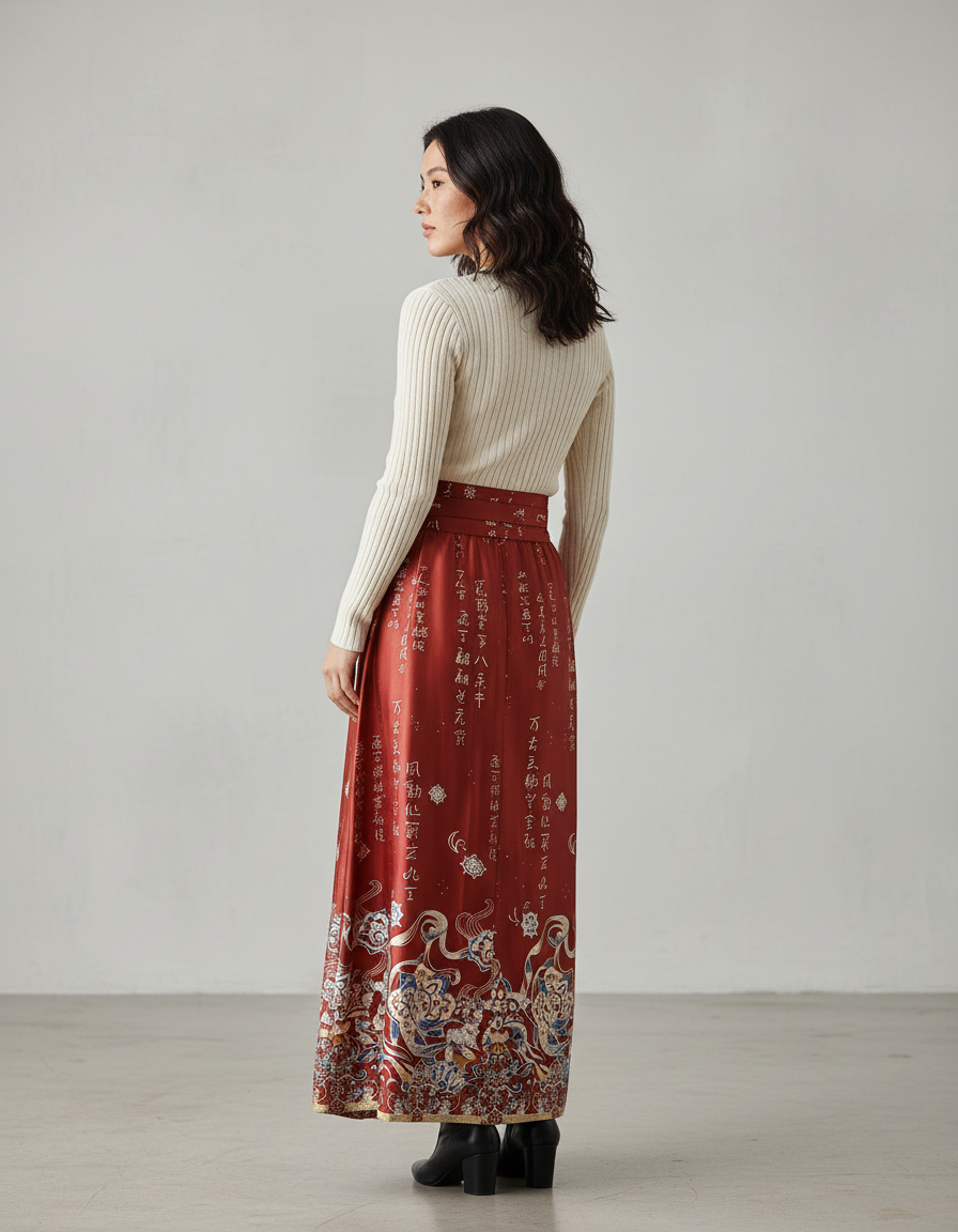 Ce qui la rend véritablement exceptionnelle, c'est son imprimé artistique exclusif. Des motifs inspirés de la calligraphie et des ornements traditionnels se déploient avec subtilité sur le tissu, faisant de cette jupe bien plus qu'un vêtement : une œuvre d'art portable. Loin des conventions, elle incarne un luxe moderne, où l'originalité rencontre le raffinement. Sa matière haut de gamme assure une fluidité et un tombé impeccables, tandis que son design intemporel garantit une polyvalence rare. Associez-la à un chemisier délicat pour une cérémonie ou un pull en maille fine pour une allure sophistiquée au quotidien. C'est une déclaration de style intemporelle.