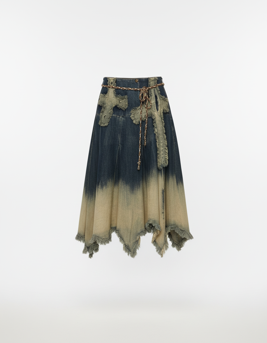 Façonnée dans un denim de qualité supérieure, cette jupe se distingue par son motif tie & dye bleu profond qui se fond délicatement vers un beige terreux, créant un contraste visuel saisissant et une texture riche. Chaque jupe est une œuvre d'art unique, grâce à son traitement artisanal. L'ourlet effiloché et la coupe asymétrique ajoutent une dimension bohème chic, tandis que les détails comme la ceinture tressée en font un vêtement véritablement exclusif. Elle se porte aussi bien avec des sandales pour un look estival qu'avec des bottes pour une touche plus audacieuse en mi-saison.
