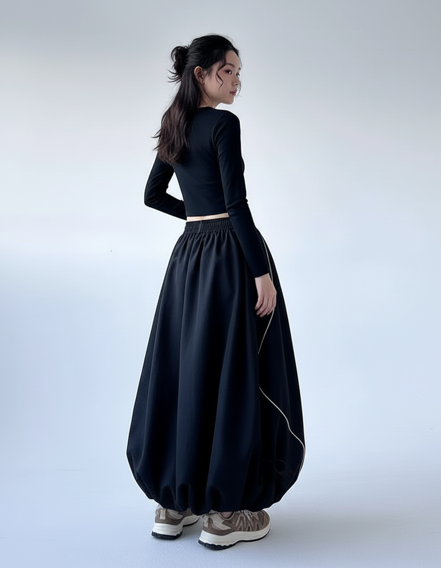 Cette jupe polyvalente s'adapte à toutes les occasions. Pour un look urbain chic, associez-la à un crop top ajusté et des baskets épurées, comme sur le modèle, révélant subtilement le ventre. Pour une soirée élégante, optez pour un chemisier en soie et des talons, transformant son allure décontractée en sophistication raffinée. Au bureau, un pull en cachemire et des bottines compléteront une tenue à la fois professionnelle et créative. La Jupe Longue Toile n'est pas qu'un vêtement, c'est une déclaration de style, une invitation à réinventer votre élégance quotidienne avec audace.