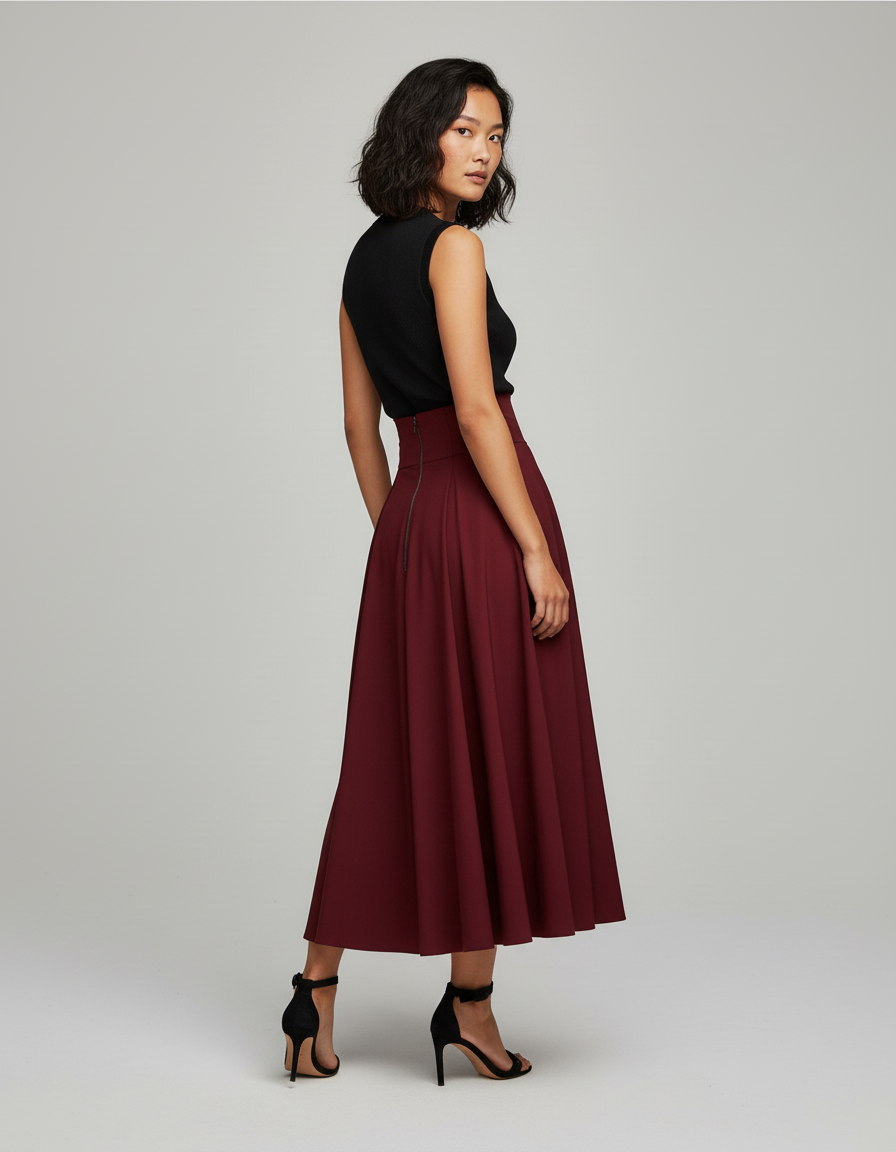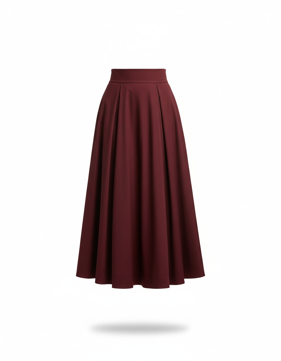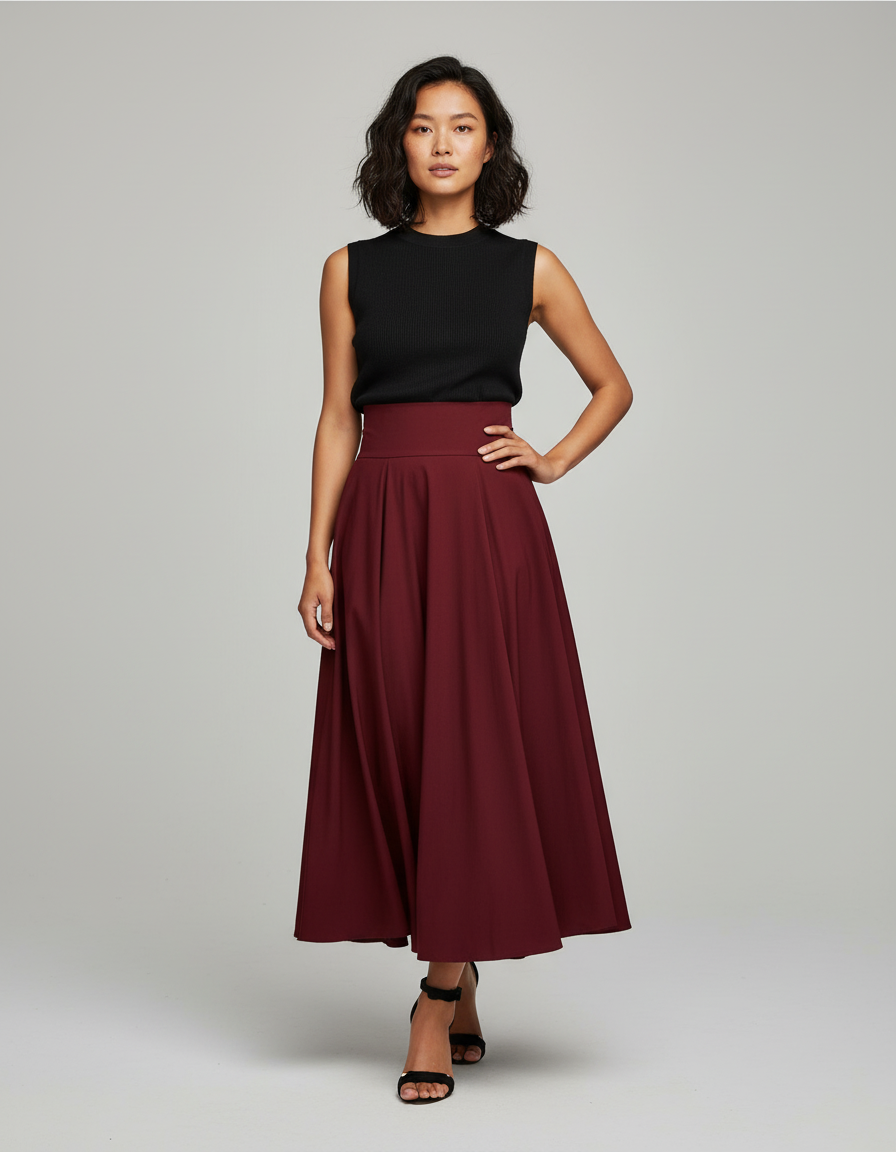 La Jupe Longue Travail, dans son riche bordeaux et son style patineuse intemporel, est conçue pour sublimer chaque moment. Pour une cérémonie, associez-la à un top en soie ajusté et des talons élégants pour une silhouette des plus raffinées. Au bureau, elle se marie parfaitement avec une blouse structurée et un blazer, offrant une prestance impeccable sans sacrifier le confort. Pour un look plus décontracté mais toujours chic, optez pour un pull fin en maille et des bottines. Sa coupe flatteuse s'adapte à toutes les occasions, vous assurant une allure sophistiquée du matin au soir.