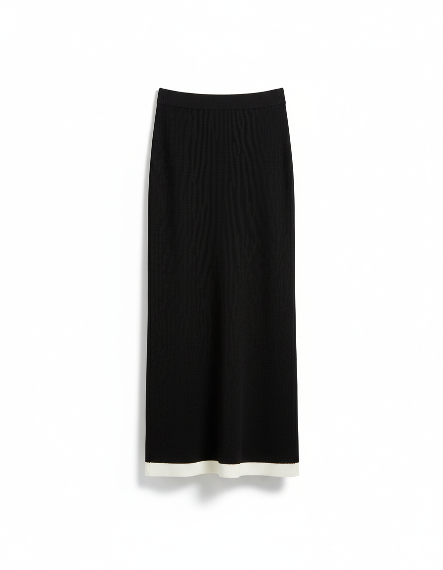 Jupe Longue Tricotée Noire Chic avec Bordure Contrastée