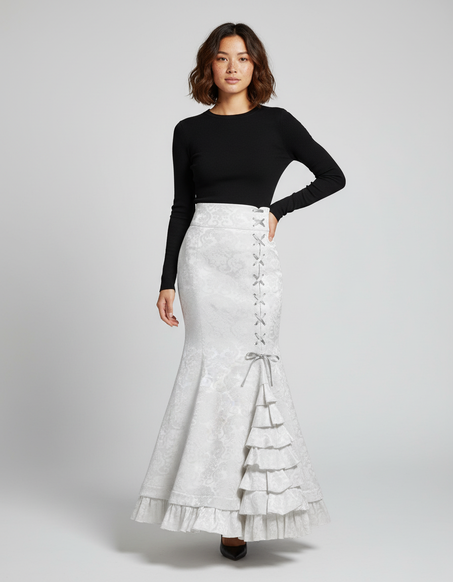 Ce modèle unique se distingue par son design trompette audacieux et ses finitions exquises. Le laçage délicat sur le côté, orné d'un nœud raffiné, apporte une touche de caractère et de féminité, tandis que les volants étagés ajoutent un mouvement captivant à chaque pas. Loin des conventions, cette jupe n'est pas qu'un vêtement, c'est une déclaration de style. Elle vous offre une sophistication sans effort, faisant de vous le centre d'attention avec une confiance sereine et un chic intemporel, inégalé.