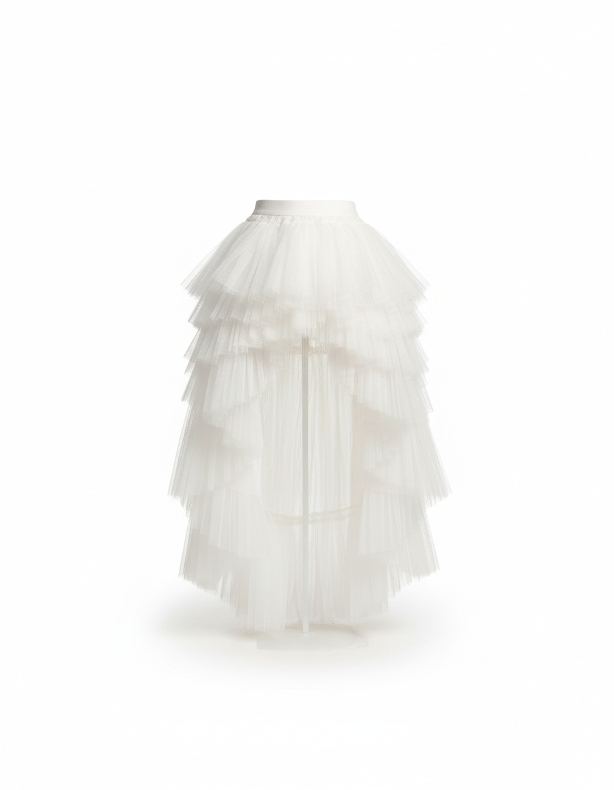 Confectionnée dans un tulle blanc immaculé, cette jupe se distingue par son design asymétrique audacieux, offrant un jeu de volumes spectaculaire qui danse à chaque mouvement. Chaque niveau de tulle est méticuleusement travaillé pour créer une texture riche et une légèreté incomparable. Plus qu'une simple jupe, c'est une déclaration de style : portez-la seule pour un impact maximal ou superposez-la sur un pantalon ajusté pour une allure avant-gardiste et résolument moderne. C'est la signature d'une garde-robe haut de gamme, pensée pour celles qui osent se démarquer avec une touche d'originalité sophistiquée.