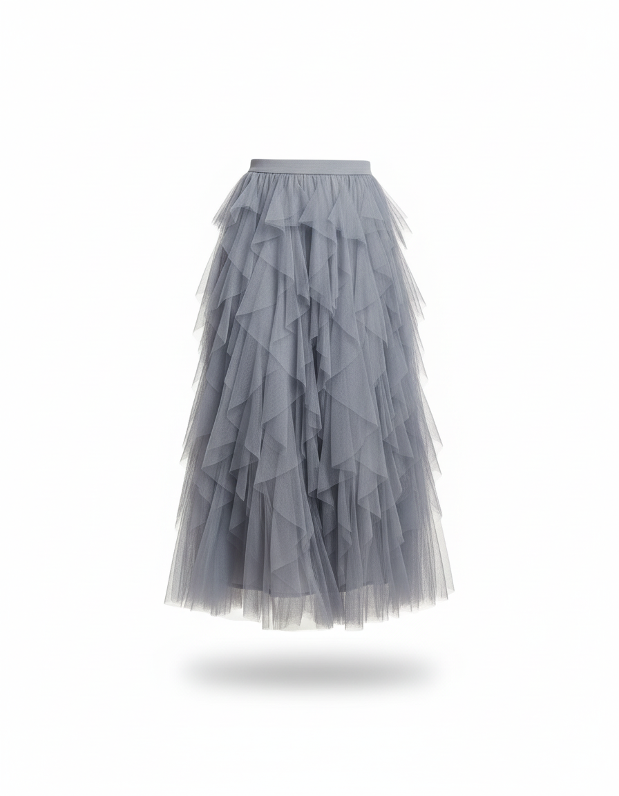 Cette jupe est un vêtement long composé de plusieurs couches de tulle. Sa couleur est un mélange de bleu et de gris, offrant une silhouette fluide.