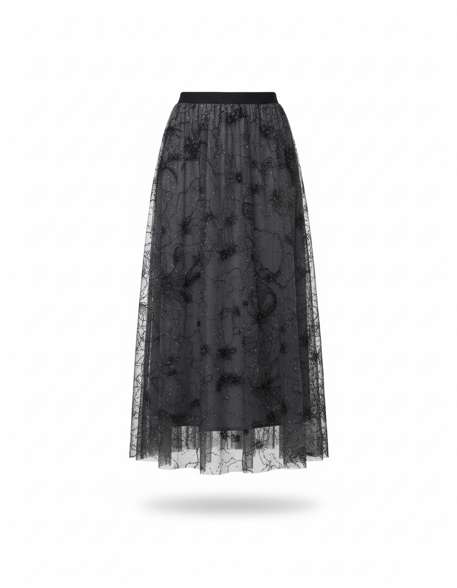 Cette jupe longue en tulle brodé est une pièce maîtresse pour une allure sophistiquée et délicate.