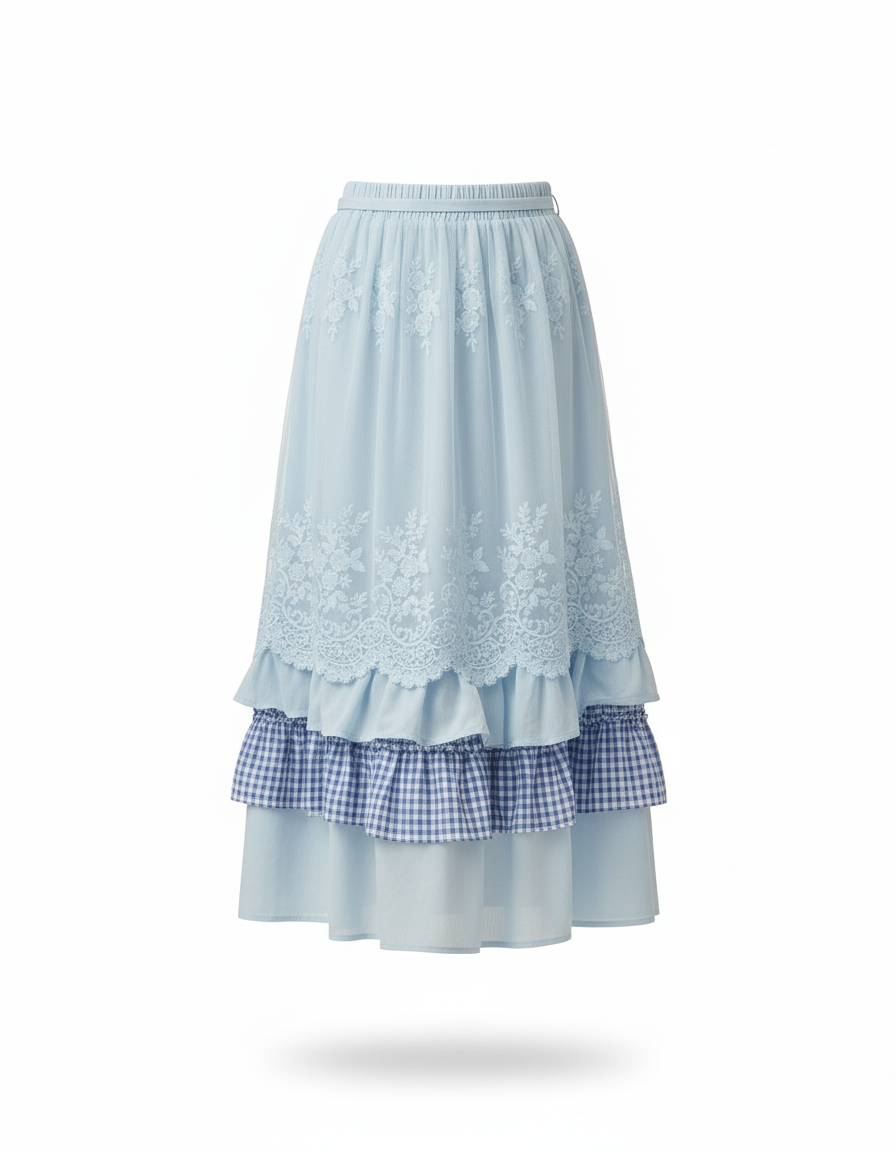 Ce qui distingue cette jupe, c'est son jeu de textures et ses détails exquis. Un voile de tulle bleu ciel délicatement brodé de dentelle florale se superpose à des volants aériens, culminant avec une touche de vichy bleu et blanc, inattendue et charmante. Cette superposition audacieuse crée une silhouette unique, à la fois romantique et contemporaine. Sa coupe longue et ample assure une liberté de mouvement et une allure majestueuse, faisant de chaque pas une déclaration de style. Une pièce maîtresse qui vous assure de vous démarquer avec une élégance naturelle et inimitable.