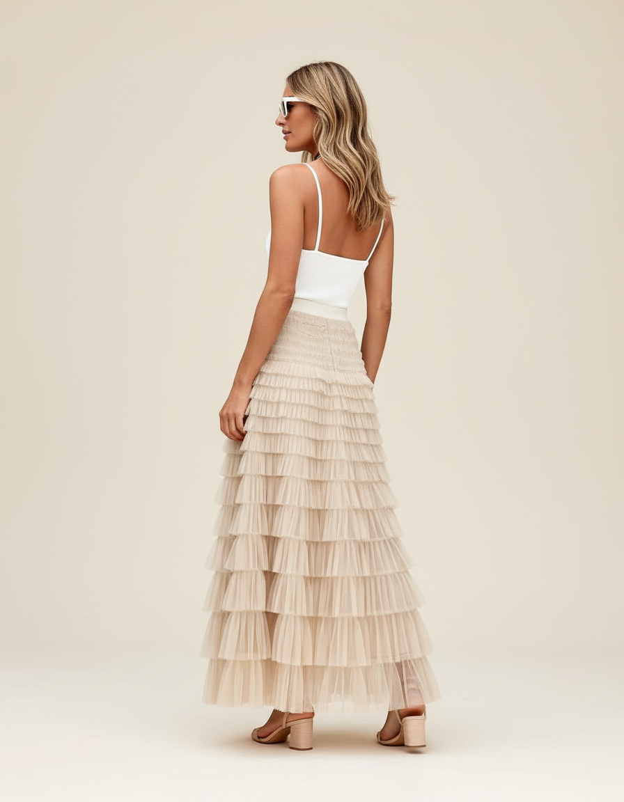 Jupe Longue Tulle Étagée Beige : L'Art du Mouvement Sublimé