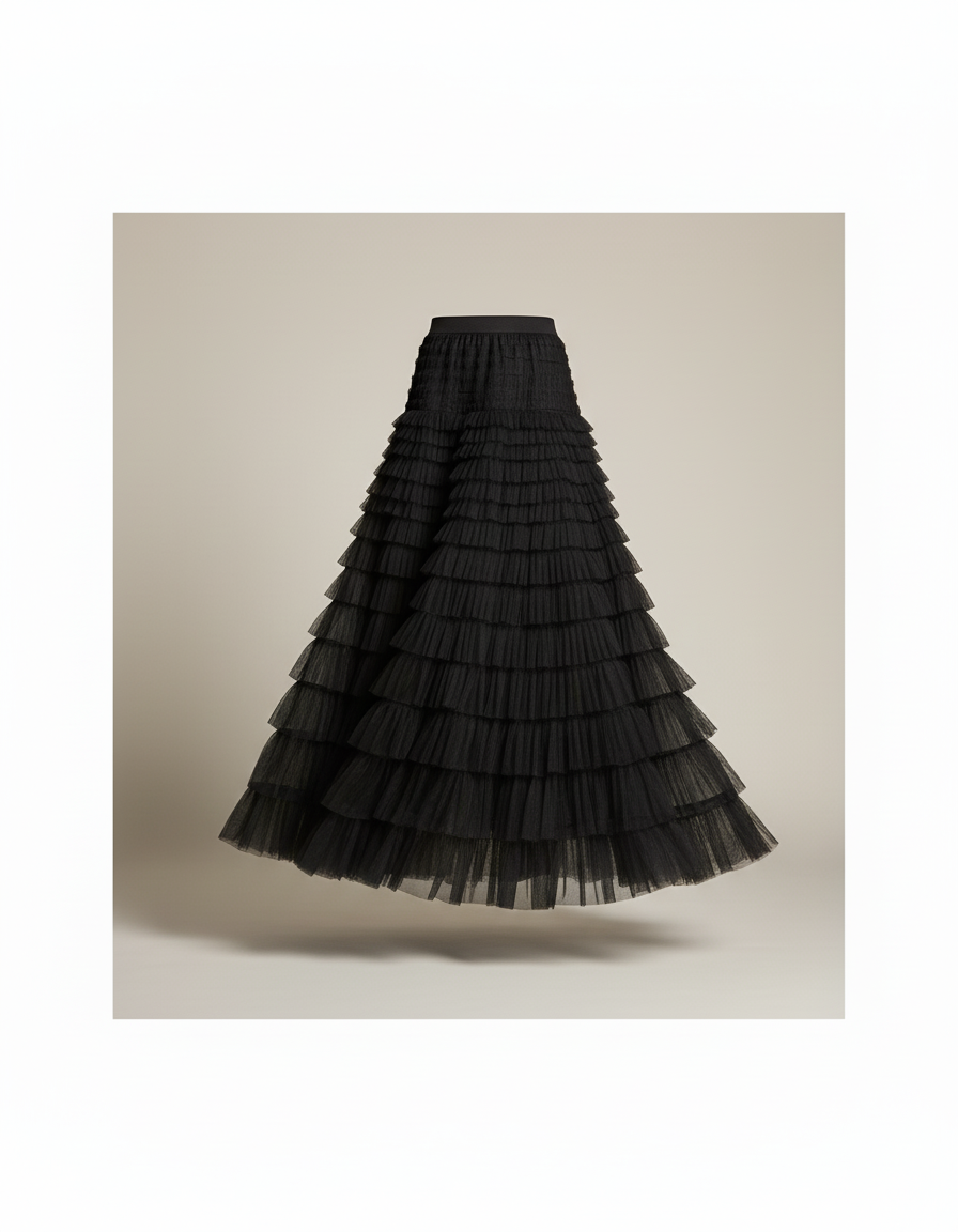 Cette jupe longue en tulle étagée offre une silhouette aérienne et sophistiquée pour toutes vos occasions spéciales.