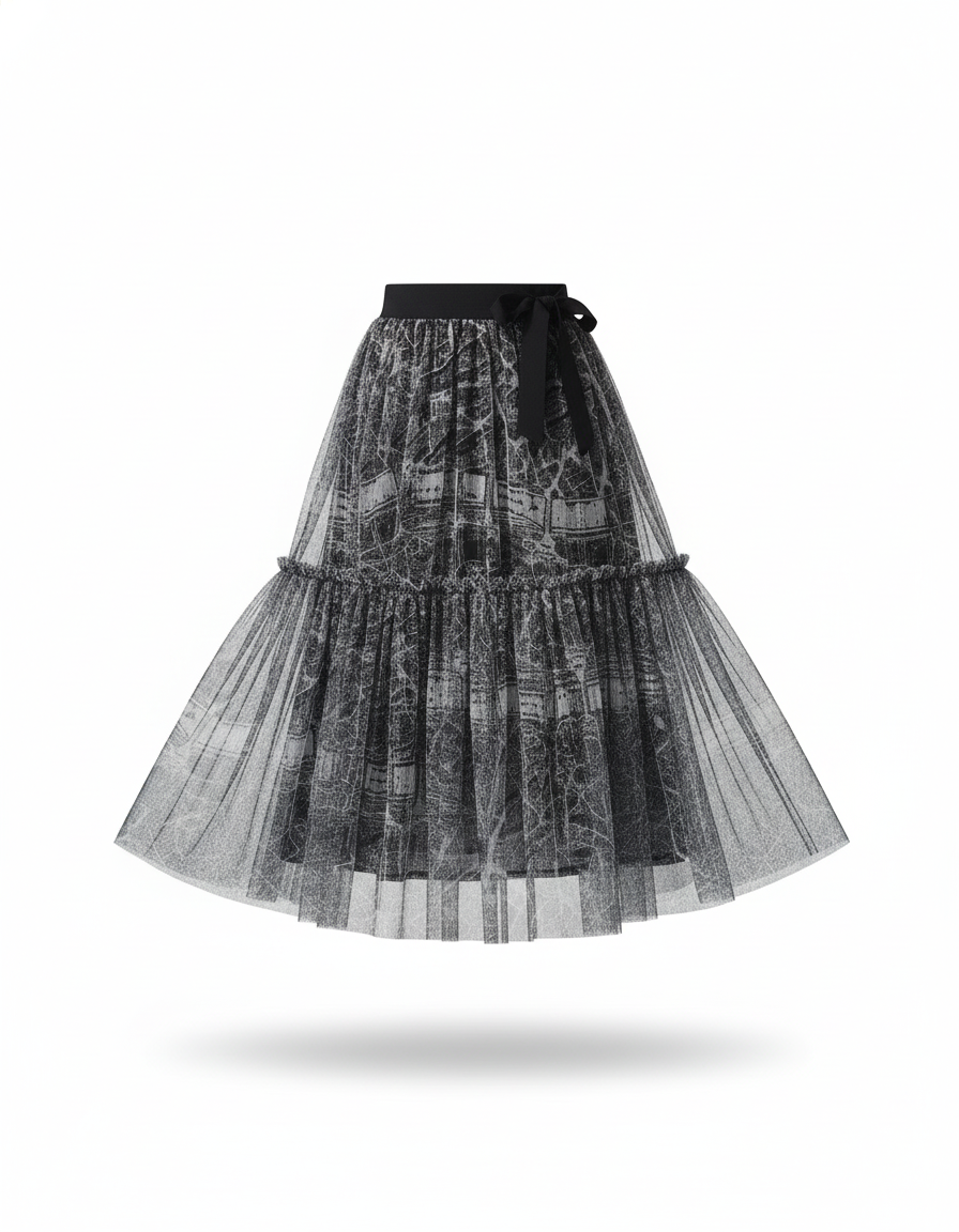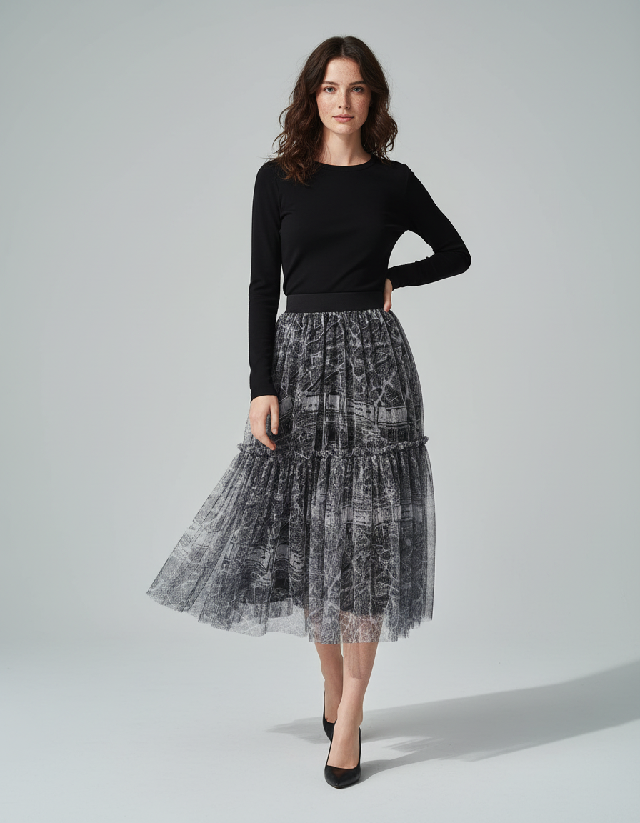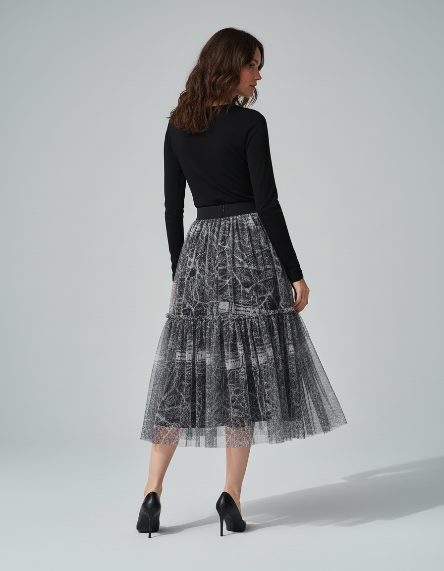 Cette jupe peut être portée pour une tenue quotidienne ou une sortie. Sa conception en tulle et son motif imprimé permettent de l'associer à différents hauts.