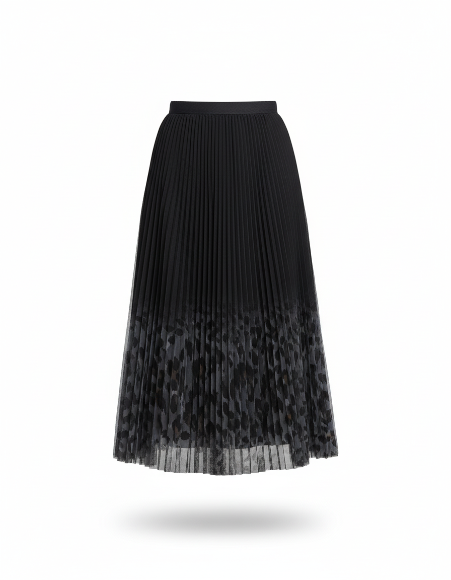 Cette jupe longue présente une coupe plissée avec un motif léopard visible sur la partie inférieure en tulle.