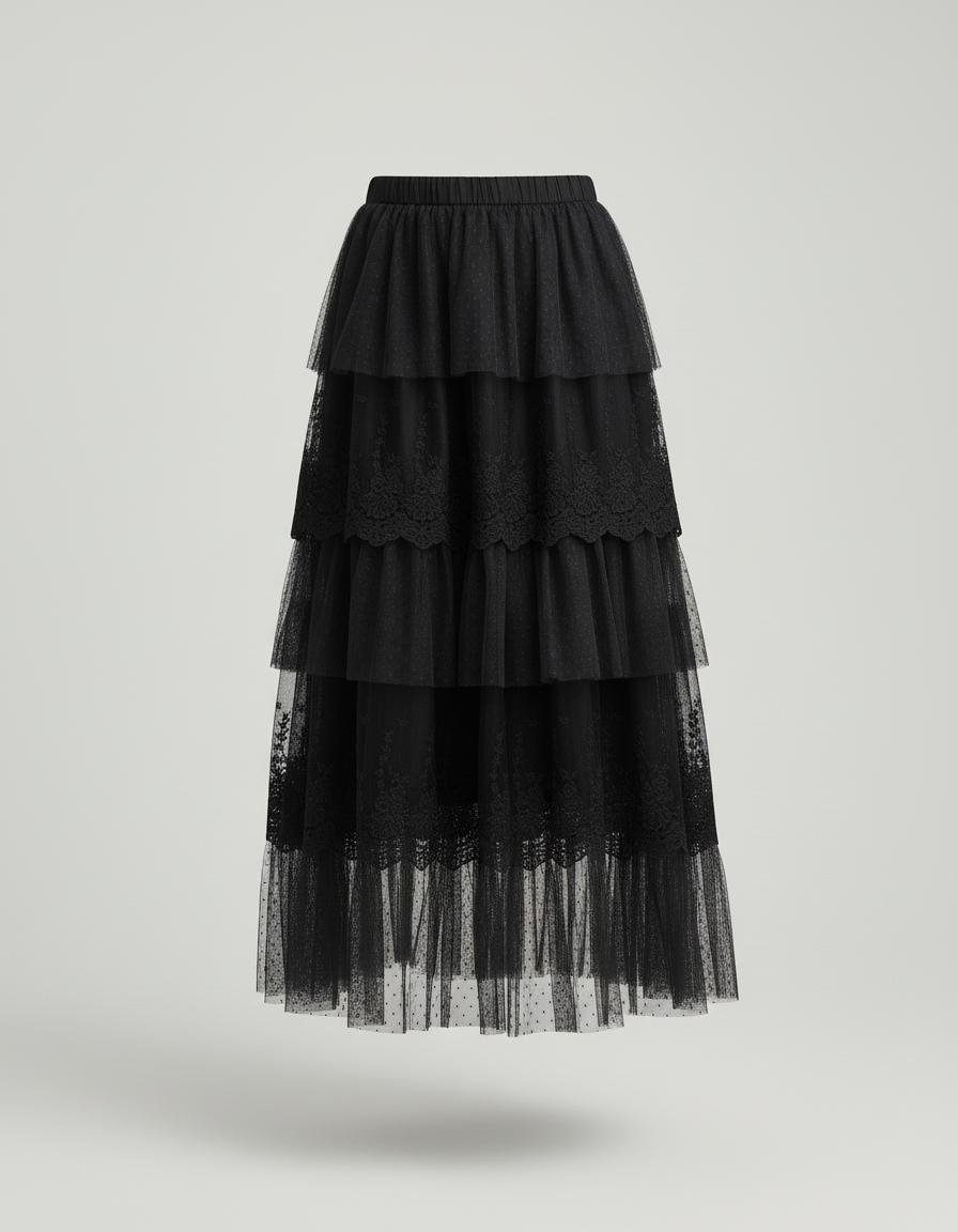 - Tulle noir multicouche avec volants.