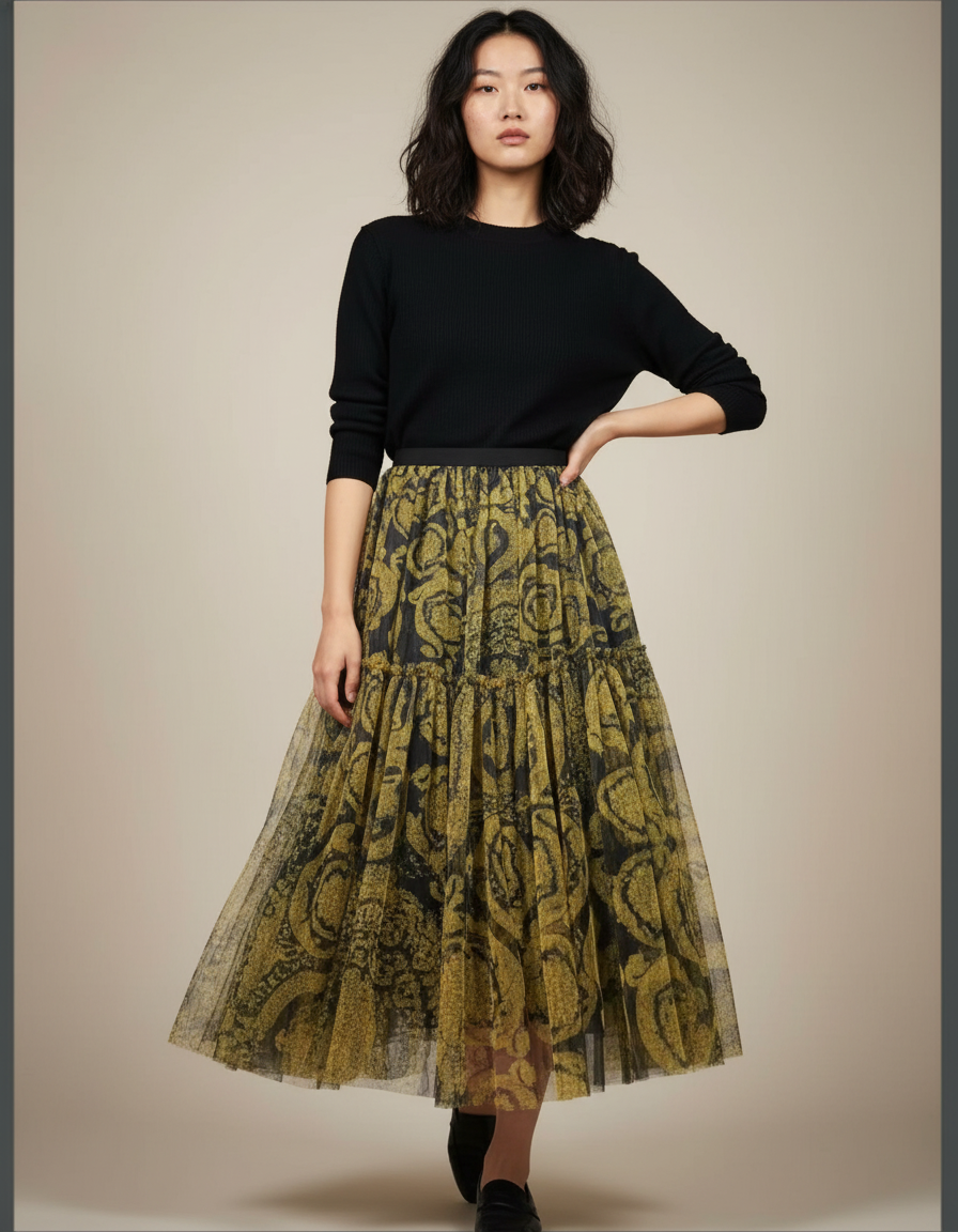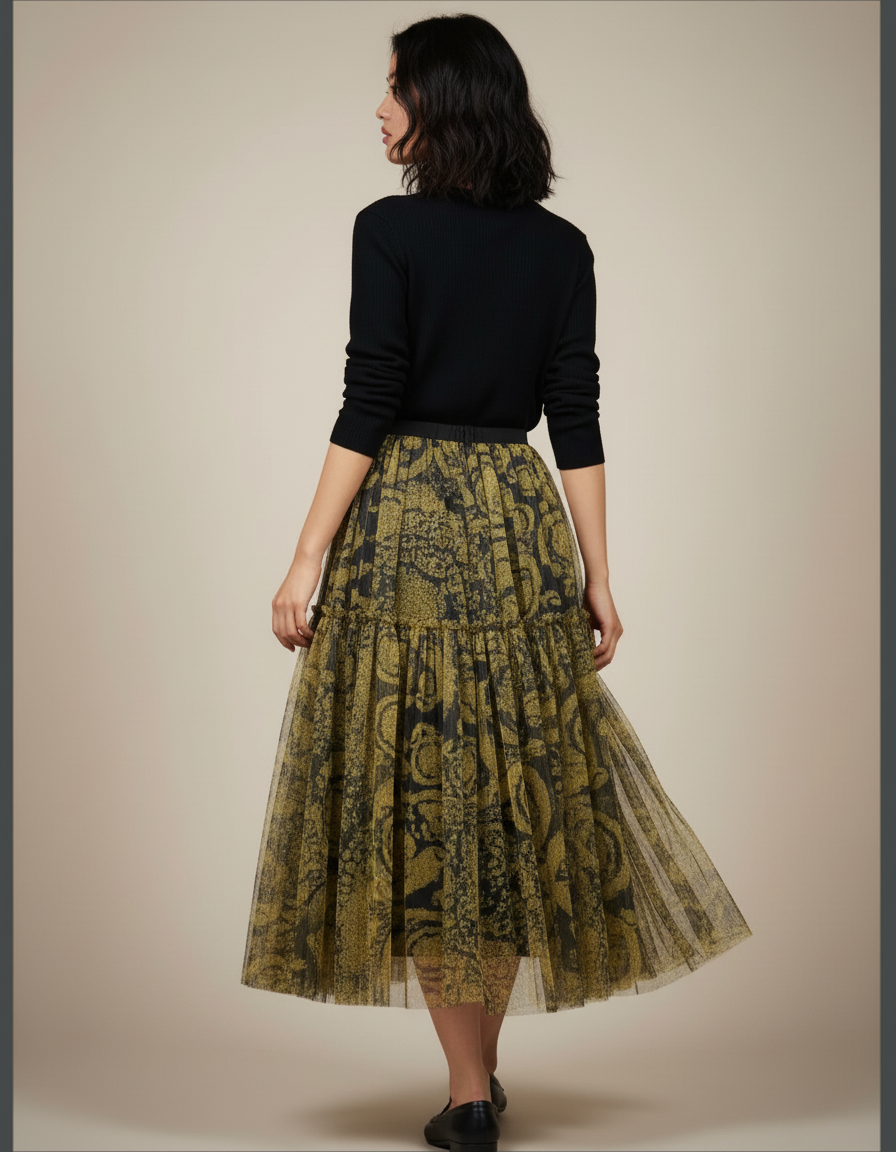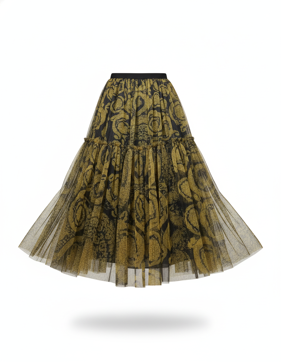 Dévoilez une allure captivante avec notre Jupe Longue Tulle Ornée Fluide. Conçue pour la femme moderne qui ne transige pas sur le style ni le confort, cette pièce maîtresse incarne une sophistication décontractée. Son tulle délicatement superposé, orné d'un motif abstrait doré et noir, crée un jeu de transparence et de texture d'une richesse incomparable. La coupe fluide et les volants subtils garantissent une silhouette aérienne et une liberté de mouvement exquise, faisant de chaque pas une déclaration de grâce.