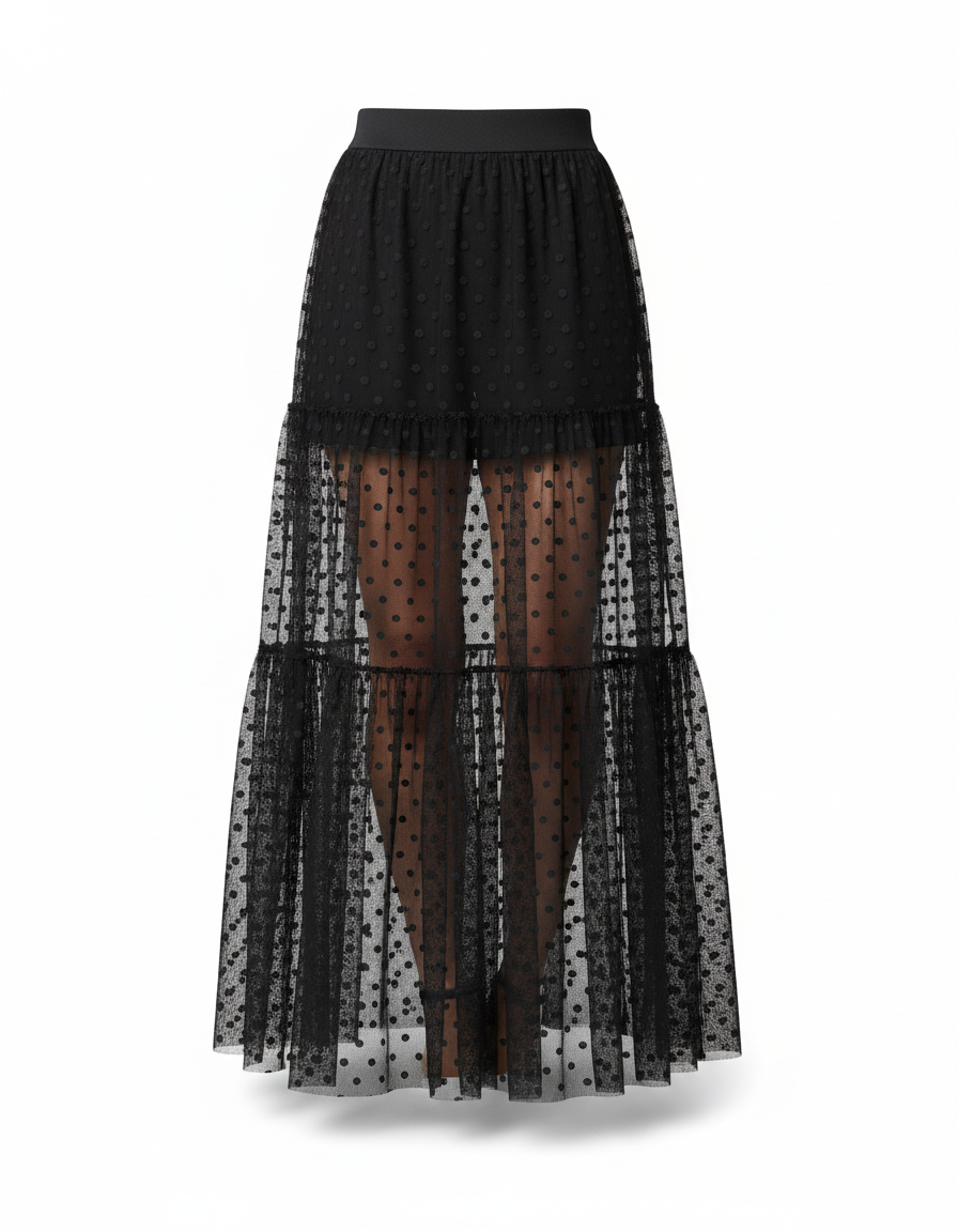 Ce qui distingue notre jupe, c'est son jeu subtil de transparence et de texture. Le tulle noir délicat, orné de pois structurés qui évoquent un effet pailleté discret, crée un mouvement captivant à chaque pas. Ses volants superposés confèrent un volume gracieux et une profondeur visuelle, tandis que la doublure courte assure une touche d'audace maîtrisée. Plus qu'une simple jupe, c'est une déclaration de style qui allie confort absolu et esthétique avant-gardiste, pensée pour celles qui veulent laisser une impression mémorable.