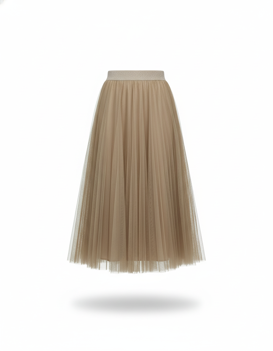 Notre jupe se distingue par son tulle finement plissé, offrant un volume gracieux et une fluidité captivante à chaque pas. La taille élastique, subtilement rehaussée d'un liseré scintillant, assure un ajustement parfait et un confort absolu tout au long de la journée, sans sacrifier l'allure. Sa teinte beige intemporelle en fait une alliée de choix, facile à marier avec vos hauts préférés, des mailles douces aux chemisiers soyeux. Adoptez cette jupe et faites l'expérience d'un luxe concret, où chaque détail est pensé pour votre bien-être et votre distinction.