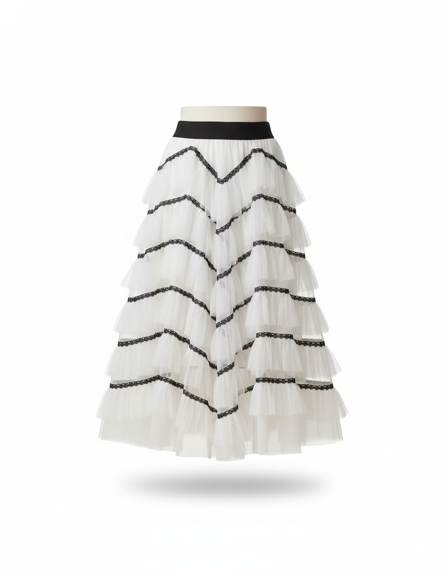 Cette jupe longue est confectionnée en tulle et présente des volants superposés. Elle intègre un design bicolore avec des détails contrastants et une taille élastique.