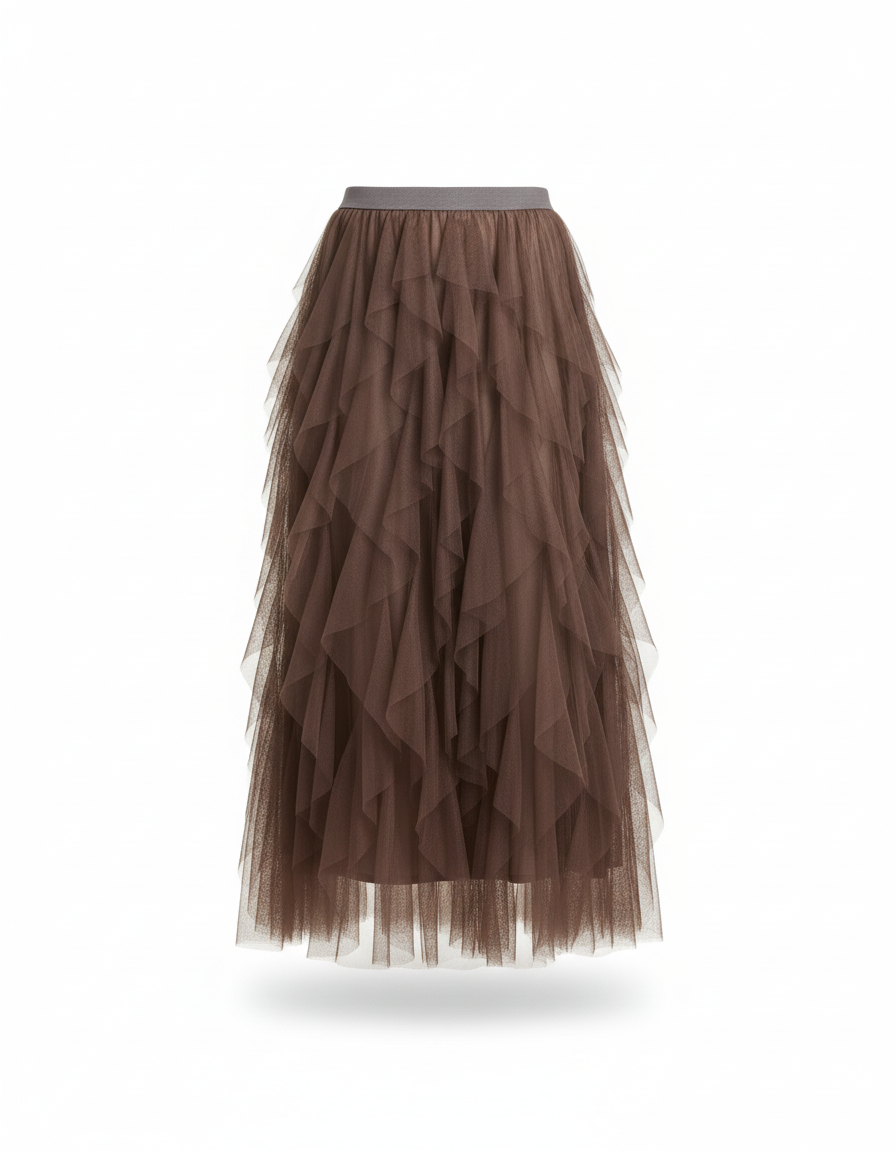 Découvrez la Jupe Longue Tulle Volantée Chic, une pièce maîtresse en tulle marron qui allie audace et raffinement. Son design ample et ses volants superposés créent un mouvement aérien et un tombé impeccable, épousant subtilement votre silhouette sans jamais la contraindre. Conçue pour offrir une liberté de mouvement absolue, elle vous enveloppe d'une légèreté incomparable, idéale pour les longues journées ou soirées. Chaque volant est pensé pour flotter avec grâce à chacun de vos pas, garantissant une allure sophistiquée et un confort premium inégalé.